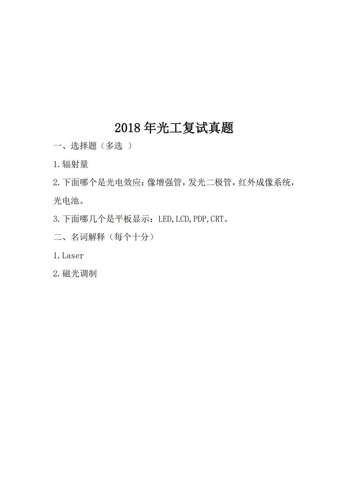 2018年光工复试真题一、选择题(多选)1.辐射量2.下面哪个是光电效应:像增强管,发光二极管,红外成像系统,光电池。3.下面哪几个是平板显示:LED,LCD,PDP,CRT。二、名词解释(每个十分)1.Laser2.磁光调制2018年光工复试真题一、选择题(多选)1.辐射量2.下面哪个是光电效应:像增强管,发光二极管,红外成像系统,光电池。3.下面哪几个是平板显示:LED,LCD,PDP,CRT。二、名词解释(每个十分)1.Laser2.磁光调制3.相干检测三、简答题(每个20分)1.光扫描的意义2.光电效应、光电导效应、禁带宽度和截止波长的关系?3.液晶显示器由哪几部分组成,原理是什么?四...