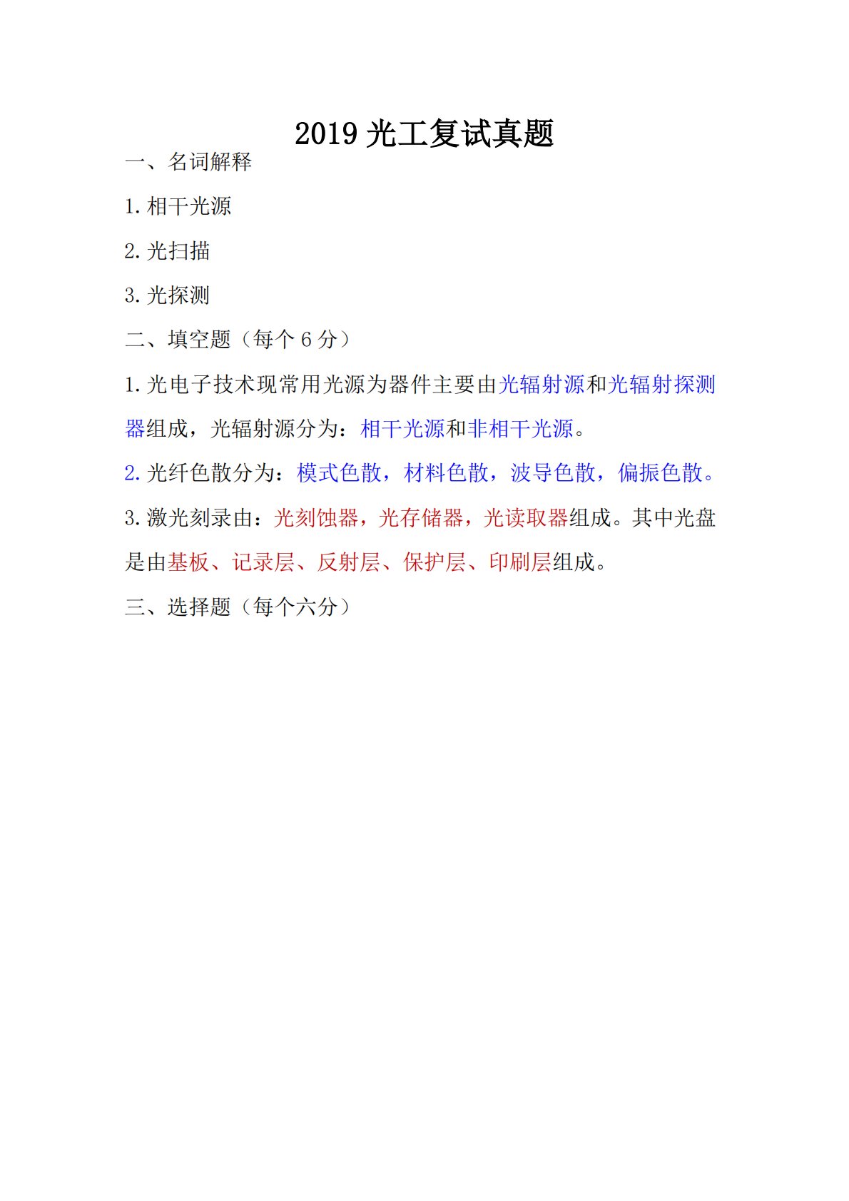 一、名词解释1.相干光源2.光扫描3.光探测二、填空题(每个6分)1.光电子技术现常用光源为器件主要由光辐射源和光辐射探测器组成,光辐射源分为:相干光源和非相干光源。2.光纤色散分为:模式色散,材料色散,波导色散,偏振色散。3.激光刻录由:光刻蚀器,光存储器,光读取器组成。其中光盘是由基板、记录层、反射层、保护层、印刷层组成。三、选择题(每个六分)2019光工复试真题六、名词解释4.相干光源5.光扫描6.光探测七、填空题(每个6分)4.光电子技术现常用光源为器件主要由光辐射源和光辐射探测器组成,光辐射源分为:相干光源和非相干光源。5.光纤色散分为:模式色散,材料色散,波导色散,偏振色散。6.激...