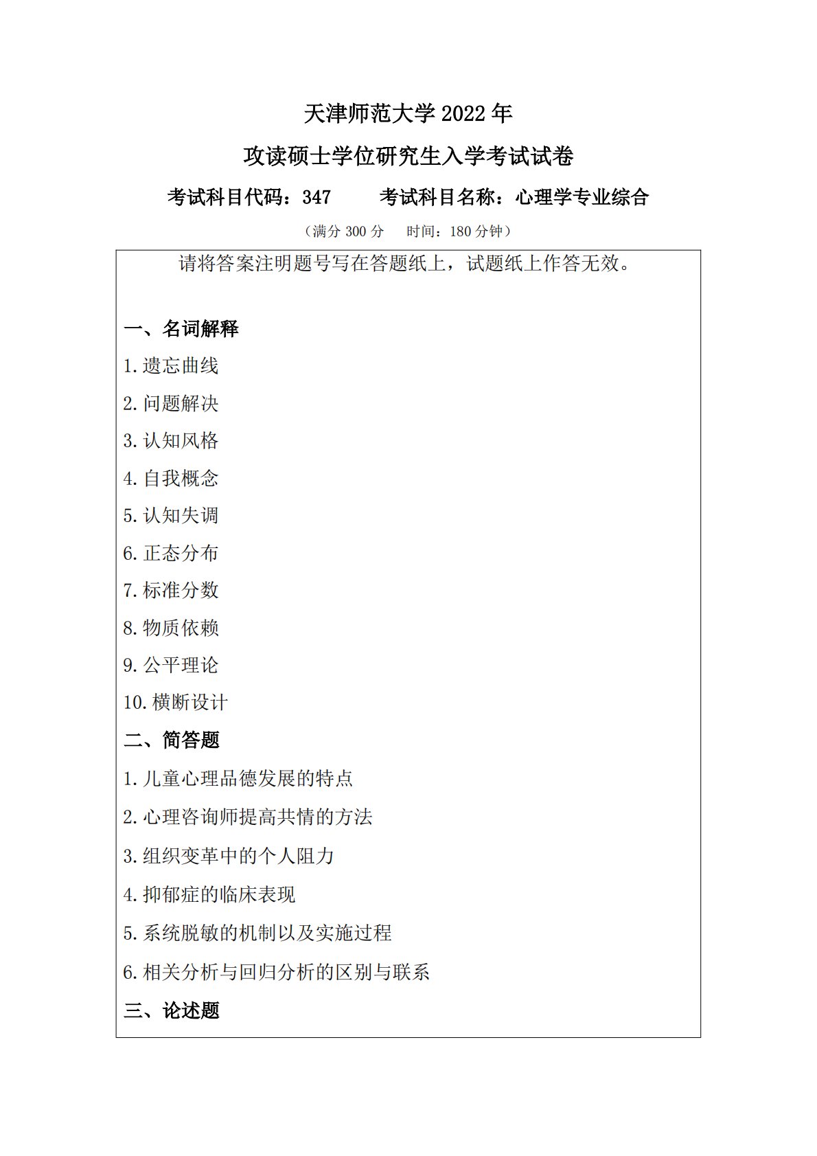 天津师范大学2022年攻读硕士学位研究生入学考试试卷考试科目代码:347考试科目名称:心理学专业综合(满分300分时间:180分钟)请将答案注明题号写在答题纸上,试题纸上作答无效。一、名词解释1.遗忘曲线2.问题解决3.认知风格4.自我概念5.认知失调6.正态分布7.标准分数8.物质依赖9.公平理论10.横断设计二、简答题1.儿童心理品德发展的特点2.心理咨询师提高共情的方法3.组织变革中的个人阻力4.抑郁症的临床表现5.系统脱敏的机制以及实施过程6.相关分析与回归分析的区别与联系三、论述题1.效度的影响因素与提高方法2.创伤后应激障碍的诊断标准与治疗3.青少年自我意识的发展特点4.社会影响与...