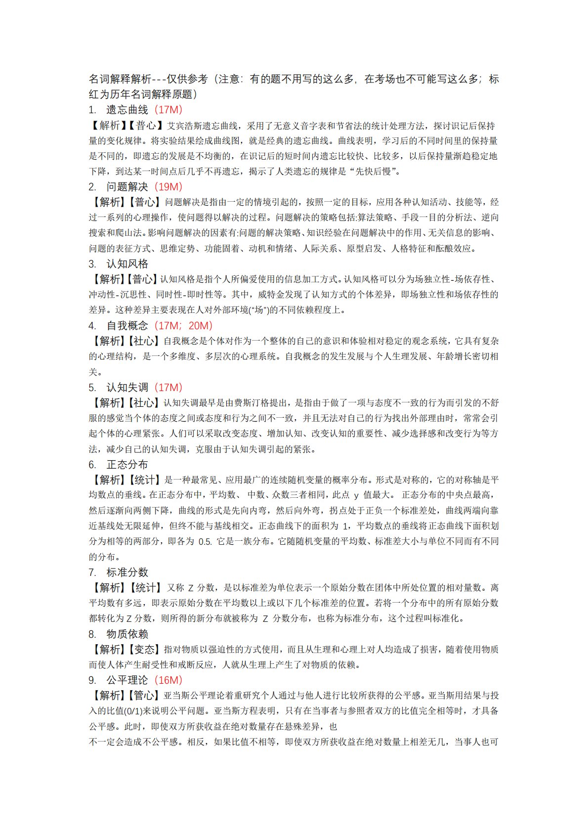 名词解释解析---仅供参考(注意:有的题不用写的这么多,在考场也不可能写这么多;标红为历年名词解释原题)1.遗忘曲线(17M)【解析】【普心】艾宾浩斯遗忘曲线,采用了无意义音字表和节省法的统计处理方法,探讨识记后保持量的变化规律。将实验结果绘成曲线图,就是经典的遗忘曲线。曲线表明,学习后的不同时间里的保持量是不同的,即遗忘的发展是不均衡的,在识记后的短时间内遗忘比较快、比较多,以后保持量渐趋稳定地下降,到达某一时间点后几乎不再遗忘,揭示了人类遗忘的规律是“先快后慢”。2.问题解决(19M)【解析】【普心】问题解决是指由一定的情境引起的,按照一定的目标,应用各种认知活动、技能等,经过一系列的心理...