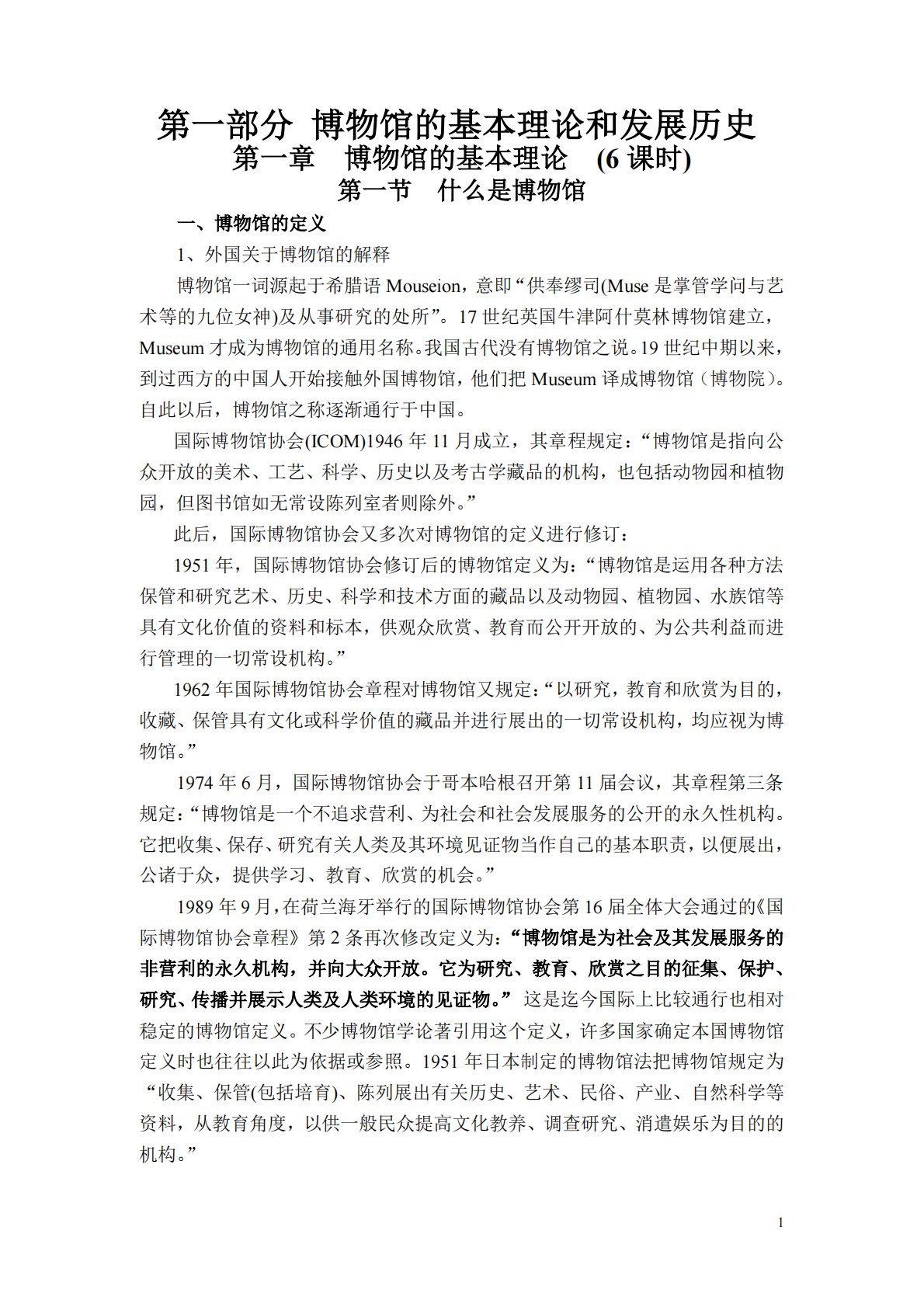 1第一部分博物馆的基本理论和发展历史第一章博物馆的基本理论(6课时)第一节什么是博物馆一、博物馆的定义1、外国关于博物馆的解释博物馆一词源起于希腊语Mouseion,意即“供奉缪司(Muse是掌管学问与艺术等的九位女神)及从事研究的处所”。17世纪英国牛津阿什莫林博物馆建立,Museum才成为博物馆的通用名称。我国古代没有博物馆之说。19世纪中期以来,到过西方的中国人开始接触外国博物馆,他们把Museum译成博物馆(博物院)。自此以后,博物馆之称逐渐通行于中国。国际博物馆协会(ICOM)1946年11月成立,其章程规定:“博物馆是指向公众开放的美术、工艺、科学、历史以及考古学藏品的机构,也包括...