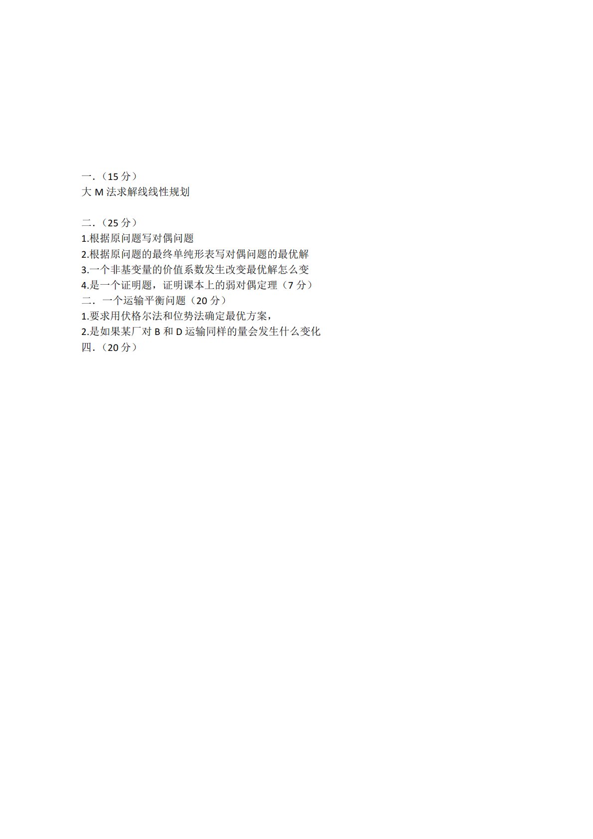 一.(15分)大M法求解线线性规划二.(25分)1.根据原问题写对偶问题2.根据原问题的最终单纯形表写对偶问题的最优解3.一个非基变量的价值系数发生改变最优解怎么变4.是一个证明题,证明课本上的弱对偶定理(7分)二.一个运输平衡问题(20分)1.要求用伏格尔法和位势法确定最优方案,2.是如果某厂对B和D运输同样的量会发生什么变化四.(20分)一.(15分)大M法求解线线性规划二.(25分)1.根据原问题写对偶问题2.根据原问题的最终单纯形表写对偶问题的最优解3.一个非基变量的价值系数发生改变最优解怎么变4.是一个证明题,证明课本上的弱对偶定理(7分)二.一个运输平衡问题(20分)1.要求用伏格...