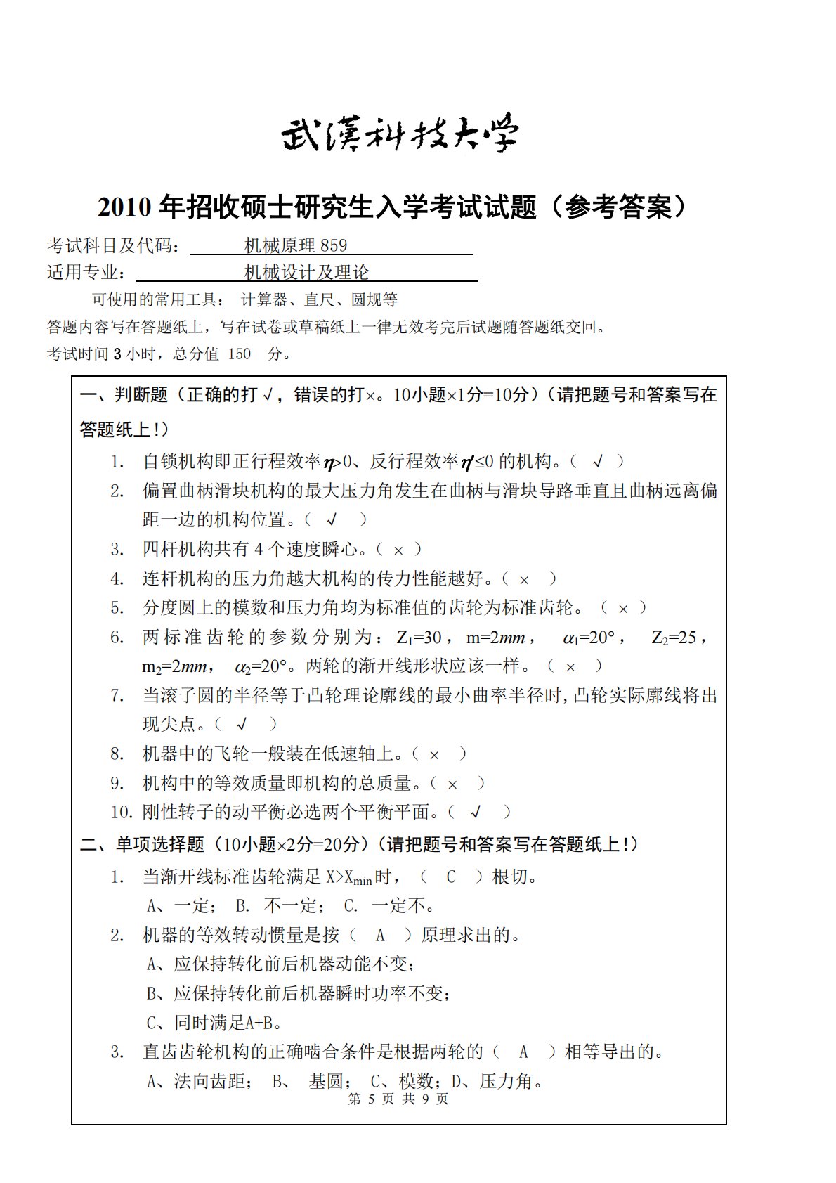 第5页共9页2010年招收硕士研究生入学考试试题(参考答案)考试科目及代码:机械原理859适用专业:机械设计及理论可使用的常用工具:计算器、直尺、圆规等答题内容写在答题纸上,写在试卷或草稿纸上一律无效考完后试题随答题纸交回。考试时间3小时,总分值150分。一、判断题(正确的打√,错误的打。10小题1分=10分)(请把题号和答案写在答题纸上!)1.自锁机构即正行程效率0、反行程效率0的机构。(√)2.偏置曲柄滑块机构的最大压力角发生在曲柄与滑块导路垂直且曲柄远离偏距一边的机构位置。(√)3.四杆机构共有4个速度瞬心。()4.连杆机构的压力角越大机构的传力性能越好。()5.分度圆...