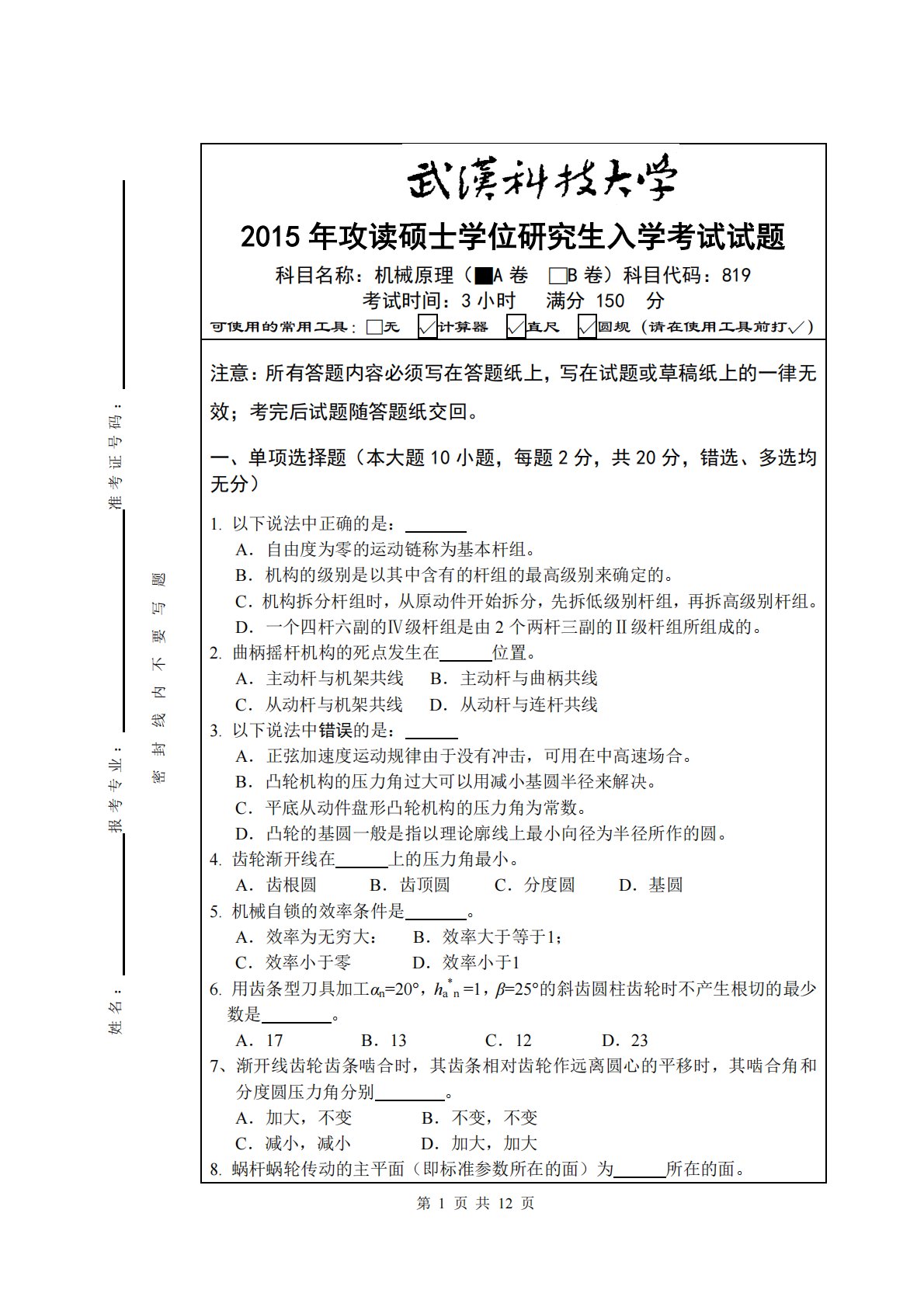 第1页共12页姓名:报考专业:准考证号码:密封线内不要写题2015年攻读硕士学位研究生入学考试试题科目名称:机械原理(■A卷□B卷)科目代码:819考试时间:3小时满分150分可使用的常用工具:□无√计算器√直尺√圆规(请在使用工具前打√)注意:所有答题内容必须写在答题纸上,写在试题或草稿纸上的一律无效;考完后试题随答题纸交回。一、单项选择题(本大题10小题,每题2分,共20分,错选、多选均无分)1.以下说法中正确的是:A.自由度为零的运动链称为基本杆组。B.机构的级别是以其中含有的杆组的最高级别来确定的。C.机构拆分杆组时,从原动件开始拆分,先拆低级别杆组,再拆高级别杆组。D.一个四杆六副的...