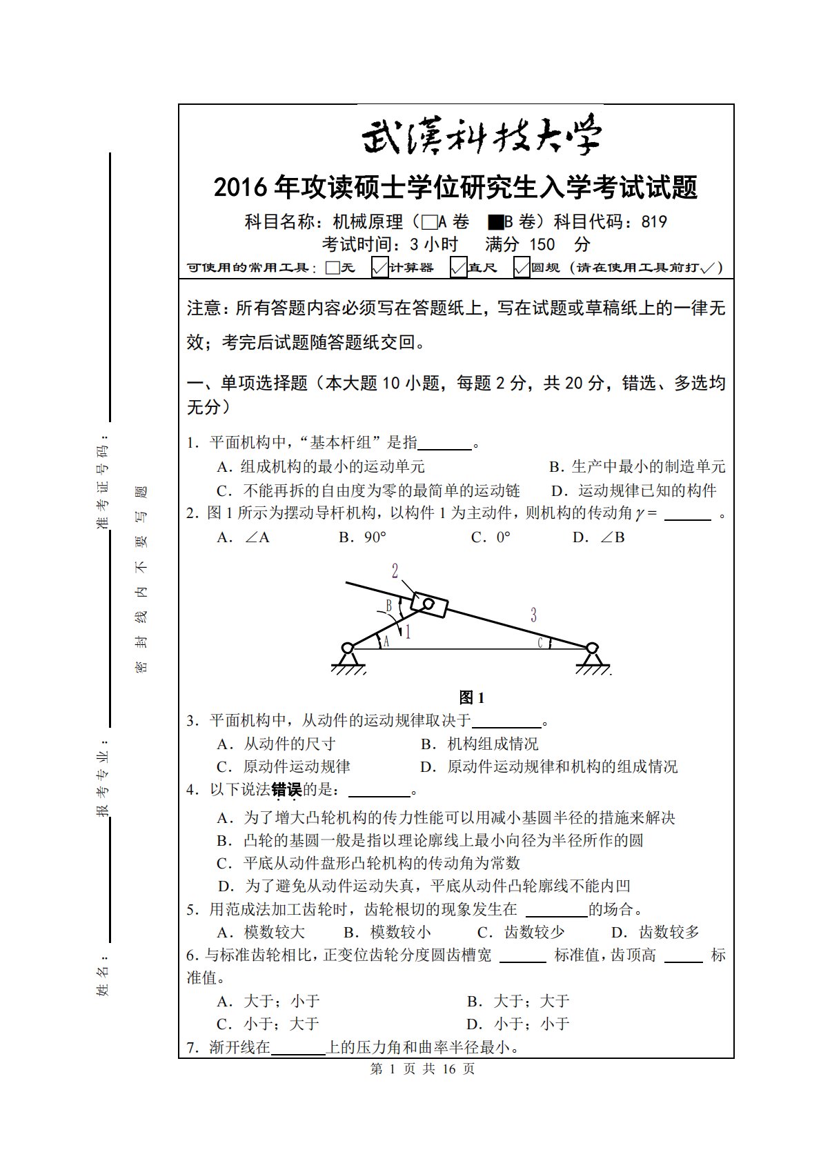 第1页共16页姓名:报考专业:准考证号码:密封线内不要写题2016年攻读硕士学位研究生入学考试试题科目名称:机械原理(□A卷■B卷)科目代码:819考试时间:3小时满分150分可使用的常用工具:□无√计算器√直尺√圆规(请在使用工具前打√)注意:所有答题内容必须写在答题纸上,写在试题或草稿纸上的一律无效;考完后试题随答题纸交回。一、单项选择题(本大题10小题,每题2分,共20分,错选、多选均无分)1.平面机构中,“基本杆组”是指。A.组成机构的最小的运动单元B.生产中最小的制造单元C.不能再拆的自由度为零的最简单的运动链D.运动规律已知的构件2.图1所示为摆动导杆机构,以构件1为主动件,则机构...