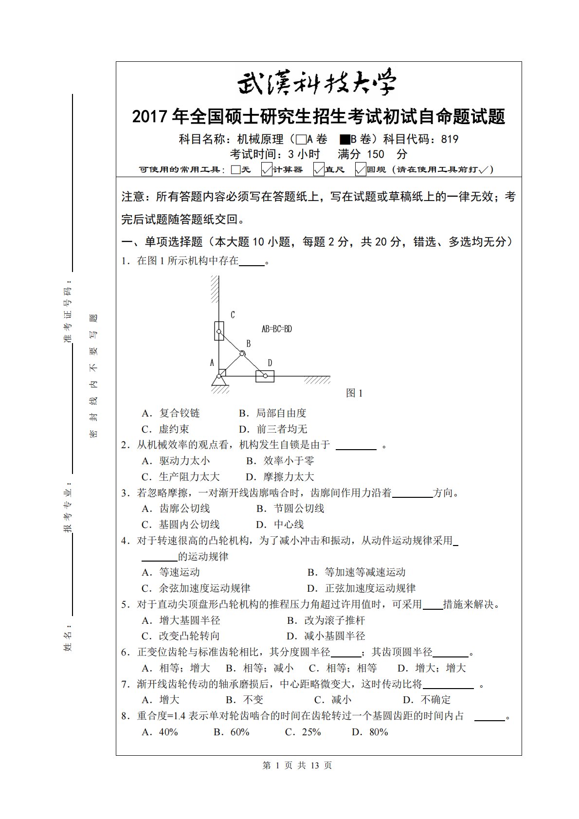 第1页共13页姓名:报考专业:准考证号码:密封线内不要写题2017年全国硕士研究生招生考试初试自命题试题科目名称:机械原理(□A卷■B卷)科目代码:819考试时间:3小时满分150分可使用的常用工具:□无√计算器√直尺√圆规(请在使用工具前打√)注意:所有答题内容必须写在答题纸上,写在试题或草稿纸上的一律无效;考完后试题随答题纸交回。一、单项选择题(本大题10小题,每题2分,共20分,错选、多选均无分)1.在图1所示机构中存在。图1A.复合铰链B.局部自由度C.虚约束D.前三者均无2.从机械效率的观点看,机构发生自锁是由于。A.驱动力太小B.效率小于零C.生产阻力太大D.摩擦力太大3.若忽略摩...