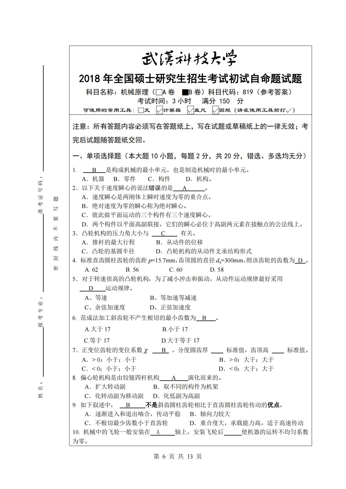 第6页共13页姓名:报考专业:准考证号码:密封线内不要写题2018年全国硕士研究生招生考试初试自命题试题科目名称:机械原理(□A卷■B卷)科目代码:819(参考答案)考试时间:3小时满分150分可使用的常用工具:□无√计算器√直尺√圆规(请在使用工具前打√)注意:所有答题内容必须写在答题纸上,写在试题或草稿纸上的一律无效;考完后试题随答题纸交回。一、单项选择题(本大题10小题,每题2分,共20分,错选、多选均无分)1.B是构成机械的最小单元,也是制造机械时的最小单元。A.机器B.零件C.构件D.机构。2.以下关于速度瞬心的说法错误的是A。A.速度瞬心是两刚体上瞬时速度为零的重合点。B.绝对速度...