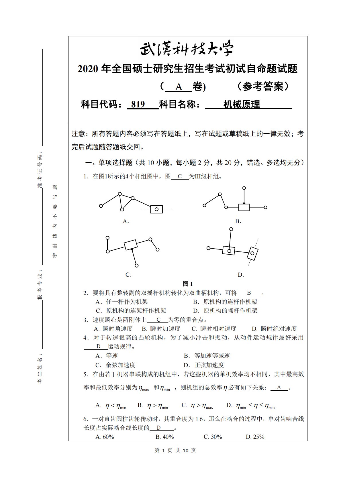 第1页共10页考生姓名:报考专业:准考证号码:密封线内不要写题2020年全国硕士研究生招生考试初试自命题试题(A卷)(参考答案)科目代码:819科目名称:机械原理注意:所有答题内容必须写在答题纸上,写在试题或草稿纸上的一律无效;考完后试题随答题纸交回。一、单项选择题(共10小题,每小题2分,共20分,错选、多选均无分)1.在图1所示的4个杆组图中,图C为III级杆组。A.B.C.D.图12.要将具有整转副的双摇杆机构转化为双曲柄机构,可将B。A.任一杆作为机架B.原机构的连杆作机架C.原机构的连架杆作机架D.原机构的摇杆作机架3.速度瞬心是两刚体上C为零的重合点。A.瞬时角速度B.瞬时加速度C...