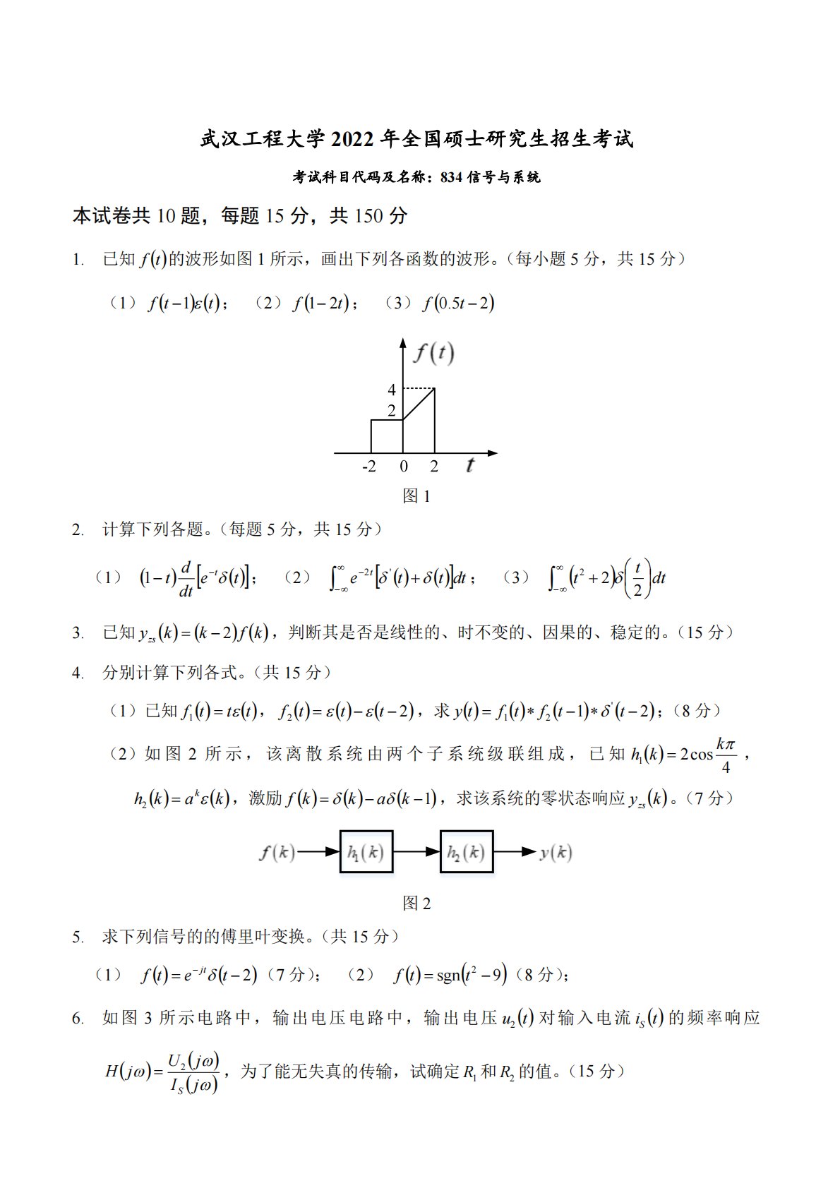 武汉工程大学834信号与系统2022年真题