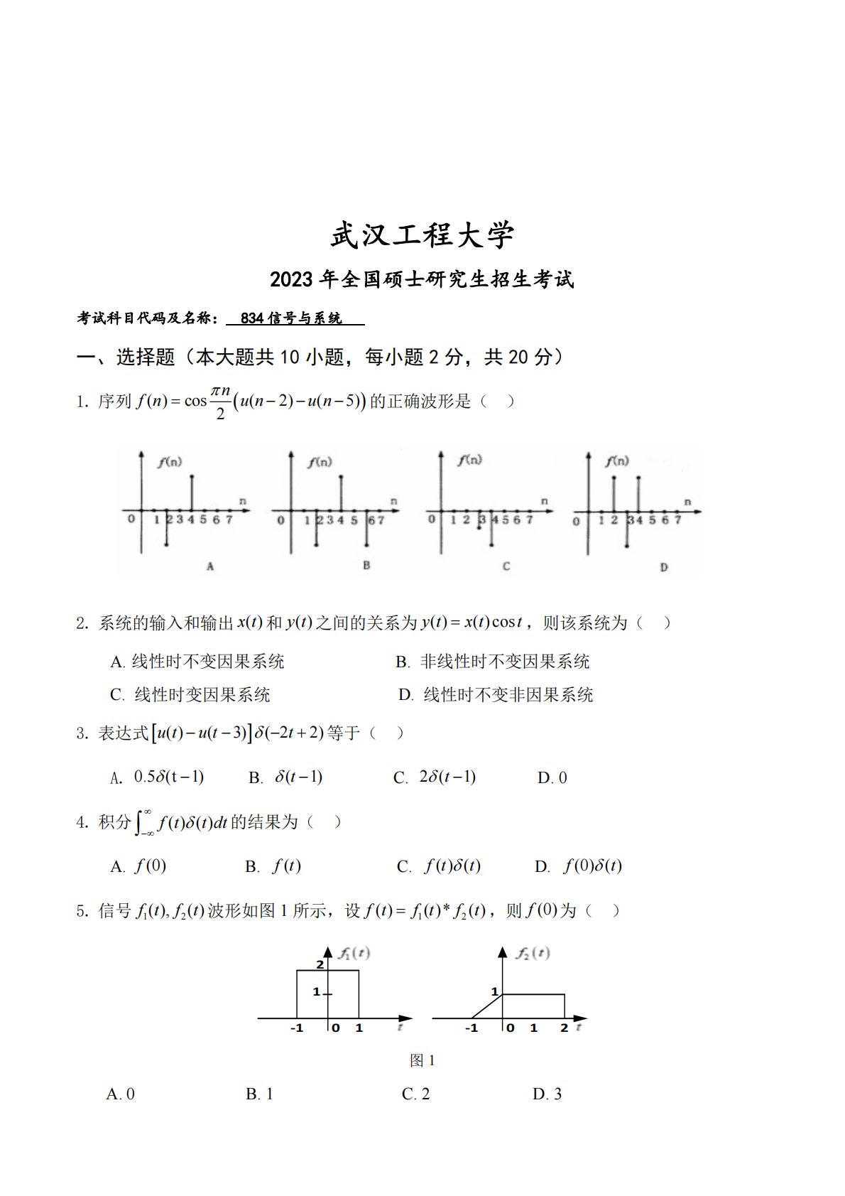 武汉工程大学2023年全国硕士研究生招生考试考试科目代码及名称:834信号与系统一、选择题(本大题共10小题,每小题2分,共20分)21.序列f(n)cosu(n2)u(n5)n的正确波形是()()()cos2.系统的输入和输出x(t)和y(t)之间的关系为ytxtt,则该系统为()A.线性时不变因果系统B.非线性时不变因果系统C.线性时变因果系统D.线性时不变非因果系统3.表达式u(t)u(t3)(2t2)等于()A.0.5(t1)B.(1)tC.2(1)tD.0()()fttdt4.积分的结果为()A.f(0)B.f(t)C.f(t)(t...