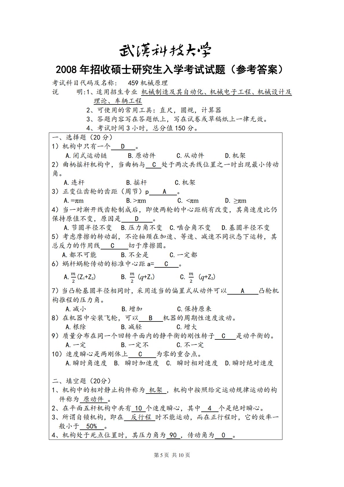 第5页共10页2008年招收硕士研究生入学考试试题(参考答案)考试科目代码及名称:459机械原理说明:1、适用招生专业机械制造及其自动化、机械电子工程、机械设计及理论、车辆工程2、可使用的常用工具:直尺,圆规,计算器3、答题内容写在答题纸上,写在试卷或草稿纸上一律无效。4、考试时间3小时,总分值150分。一、选择题(20分)1)机构中只有一个D。A.闭式运动链B.原动件C.从动件D.机架2)曲柄摇杆机构中,当曲柄与C处于两次共线位置之一时出现最小传动角。A.连杆B.摇杆C.机架3)正变位齿轮的齿距(周节)pA。A.=πmB.>πmC.