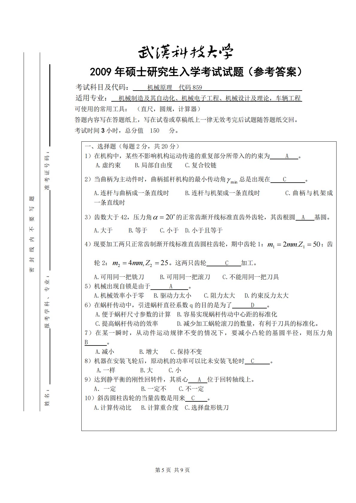 第5页共9页2009年硕士研究生入学考试试题(参考答案)考试科目及代码:机械原理代码859适用专业:机械制造及其自动化、机械电子工程、机械设计及理论,车辆工程可使用的常用工具:(直尺,圆规,计算器)答题内容写在答题纸上,写在试卷或草稿纸上一律无效考完后试题随答题纸交回。考试时间3小时,总分值150分。姓名:报考学科、专业:准考证号码:密封线内不要写题一、选择题(每题2分,共20分)1)在机构中,某些不影响机构运动传递的重复部分所带入的约束为A。A.虚约束B.局部自由度C.复合铰链2)当曲柄为主动件时,曲柄摇杆机构的最小传动角总是出现在C。A.连杆与曲柄成一条直线时B.连杆与机架成一条直线时C....