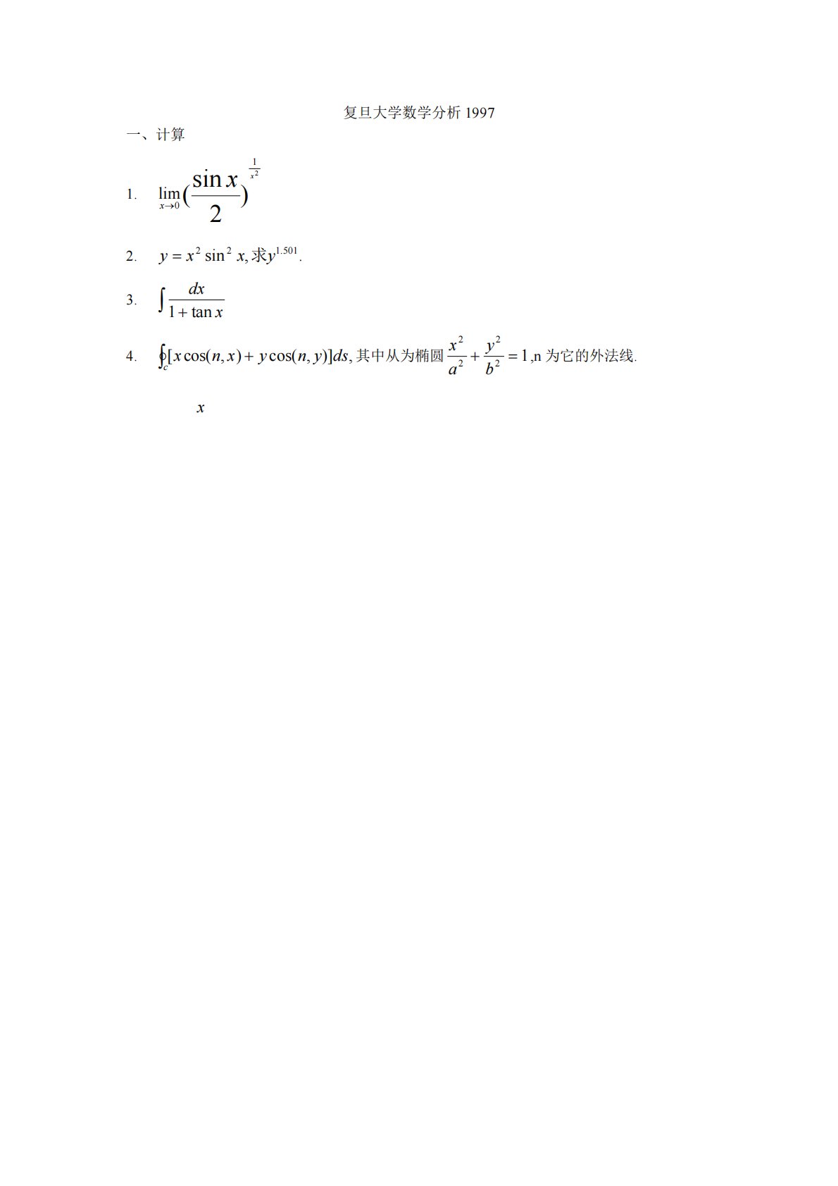 复旦大学数学分析1997一、计算1.)2sin(210limxxx2..,sin501.122yxxy求3.xdxtan14.,)],cos(),cos([cdsynyxnx其中从为椭圆12222byax,n为它的外法线.x复旦大学数学分析1997一、计算1.)2sin(210limxxx2..,sin501.122yxxy求3.xdxtan14.,)],cos(),cos([cdsynyxnx其中从为椭圆12222byax,n为它的外法线.5.Ddxdyyx2ln,D是由y=x,y=1,x=2围成的三角形.6.计算由曲面ayxayxayx,...