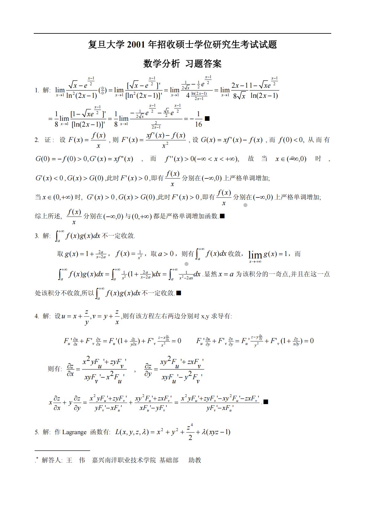 复旦大学2001年招收硕士学位研究生考试试题数学分析习题答案1.解:111112222200ln(21)22111121[]'211lim()limlimlimln(21)[ln(21)]'4ln(21)8xxxxxxxxxxe12xxexexxxx−−−−→→→→−−−−−===−−xex−−−111122222211211[1]'11limlim8[ln(21)]'81xxxxxxxxeexex−−−→→−−−−==−6=−■2.证:设xxfxF)()(=,则2)()(')('xxfxxfxF−=,设)()(')(xfxxfxG−=,而从而有,0)0(