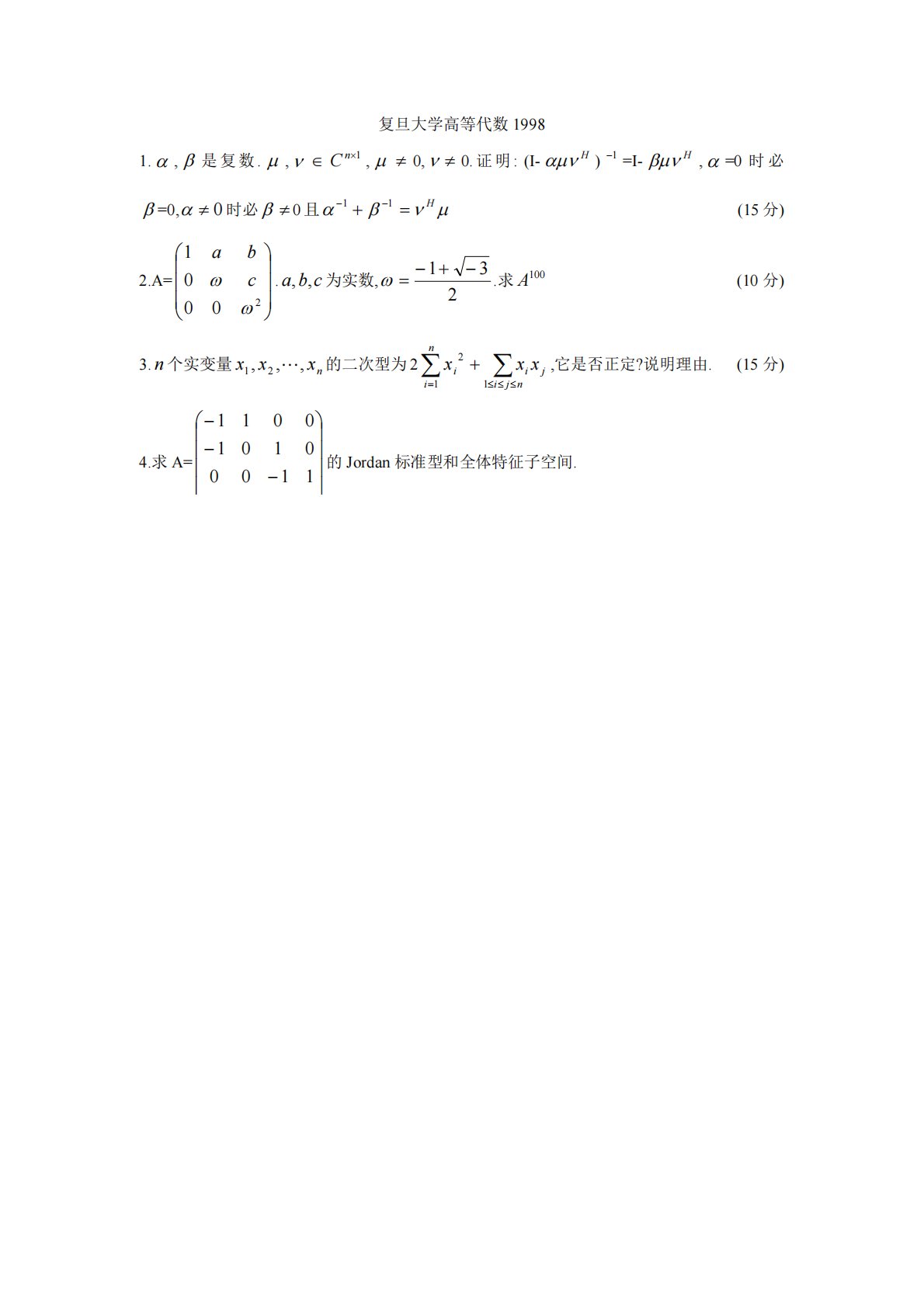 复旦大学高等代数19981.,是复数.,1nC,0,0.证明:(I-H)1=I-H,=0时必=0,0时必0且H11(15分)2.A=20001cba.cba,,为实数,231.求100A(10分)3.n个实变量nxxx,,,21的二次型为2njijiniixxx112,它是否正定?说明理由.(15分)4.求A=110001010011的Jordan标准型和全体特征子空间.复旦大学高等代数19981.,是复数.,1nC,0,0.证明:(I-...