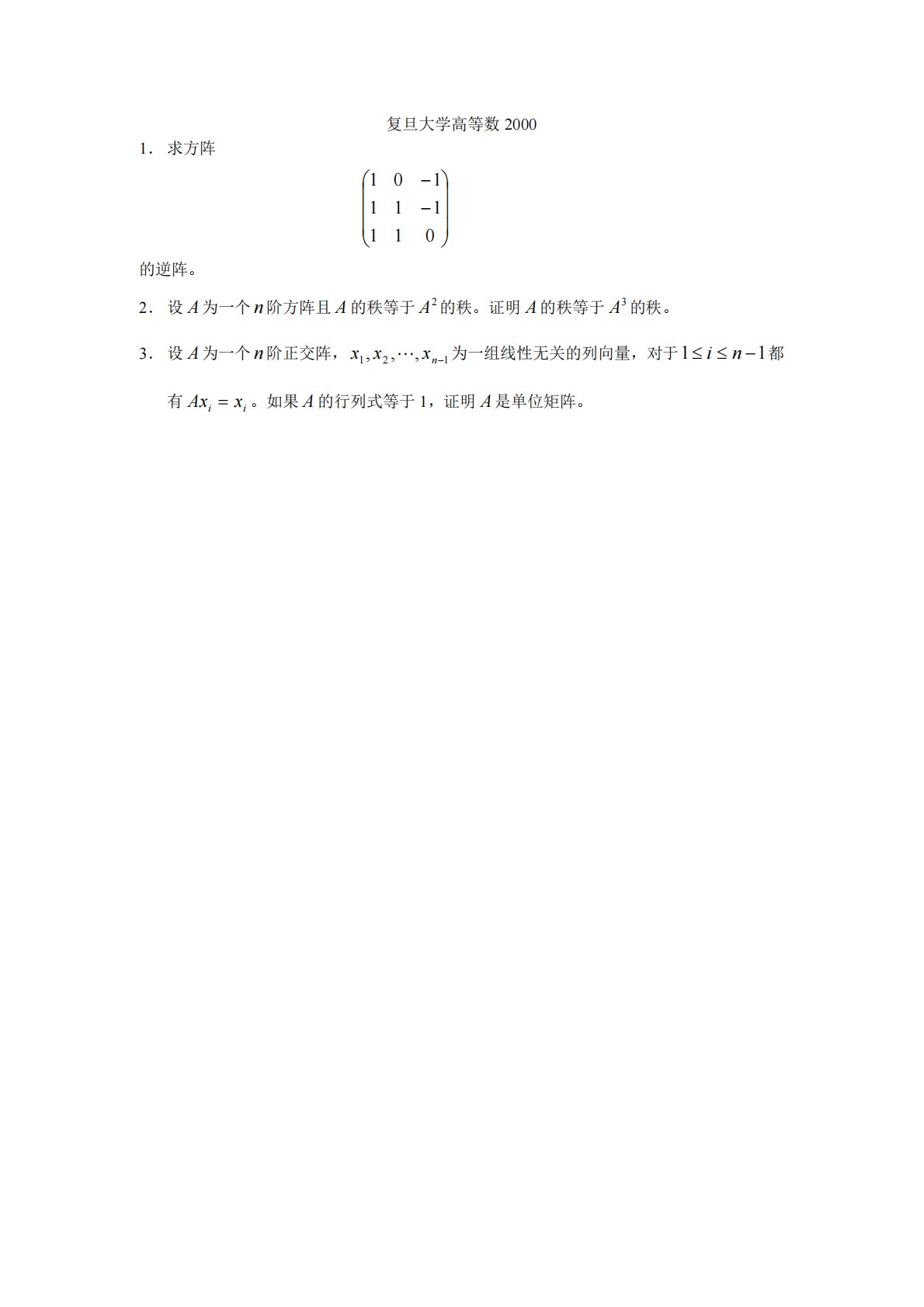 复旦大学高等数20001.求方阵011111101的逆阵。2.设A为一个n阶方阵且A的秩等于2A的秩。证明A的秩等于3A的秩。3.设A为一个n阶正交阵,121,,,nxxx为一组线性无关的列向量,对于11ni都有iixAx。如果A的行列式等于1,证明A是单位矩阵。复旦大学高等数20001.求方阵011111101的逆阵。2.设A为一个n阶方阵且A的秩等于2A的秩。证明A的秩等于3A的秩。3.设A为一个n阶正交阵,121,,,nxxx为一组线性无关的列向量,对于11ni都有iixAx。如果A的行列式等于1,证明A是单位矩阵。...