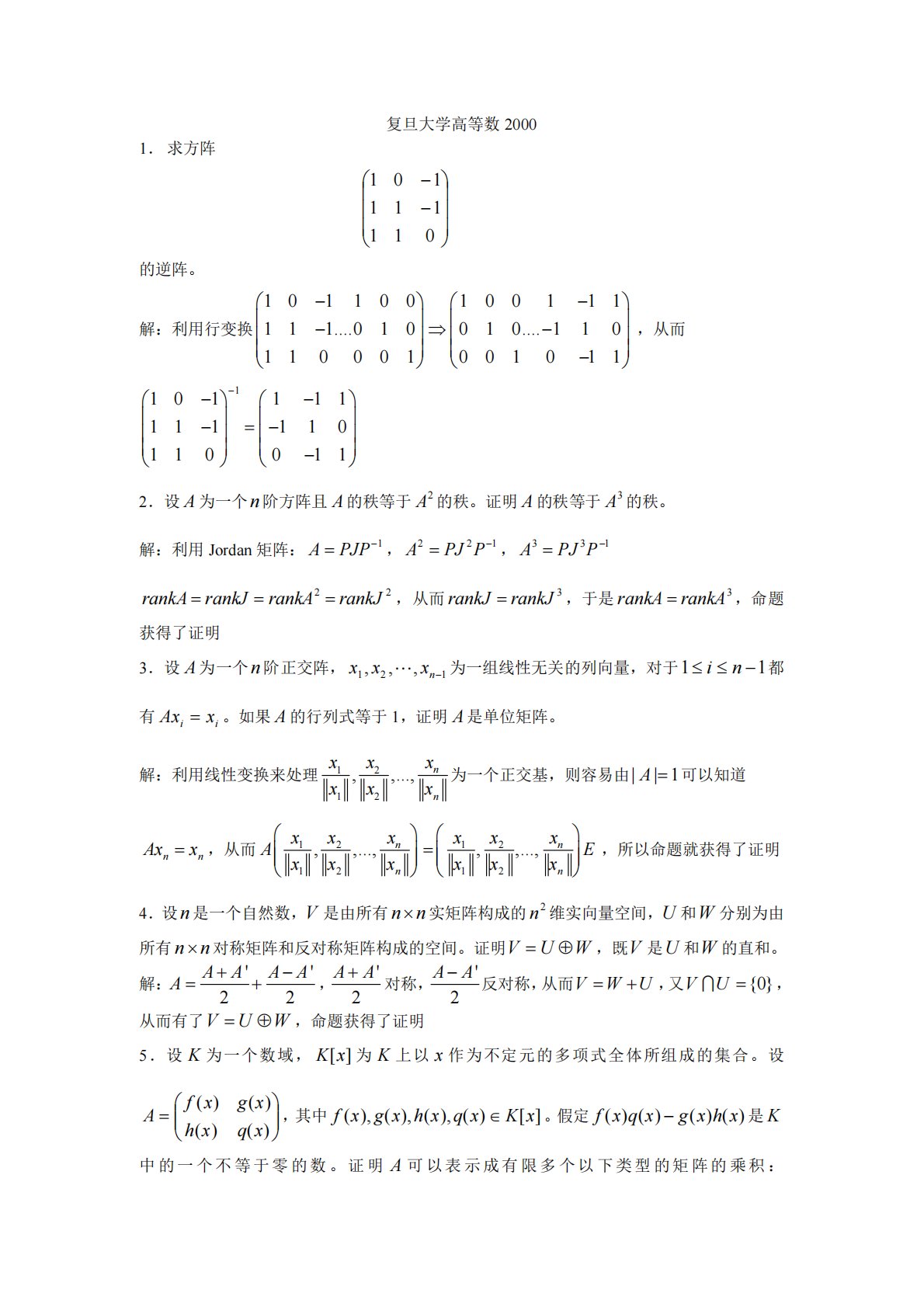 复旦大学835代数与几何2000年真题答案(高等代数)