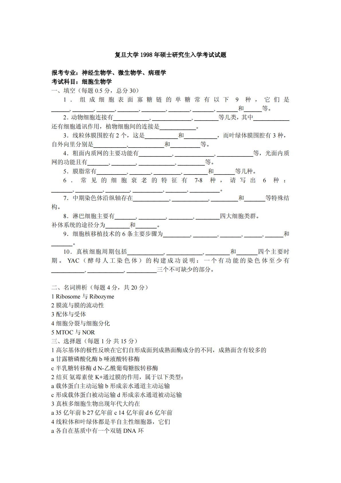 复旦大学1998年硕士研究生入学考试试题报考专业:神经生物学、微生物学、病理学考试科目:细胞生物学一、填空(每题0.5分,总分30)1.组成细胞表面寡糖链的单糖常有以下9种,它们是______,_______,______,_______,________,_______,_______,_______和______等。2.动物细胞连接有____________,_____________,________等几类,其中____________还有细胞通讯作用,植物细胞间的连接是____________。3.线粒体膜围腔有2个,这是___________和___________,而叶绿体膜围腔有...