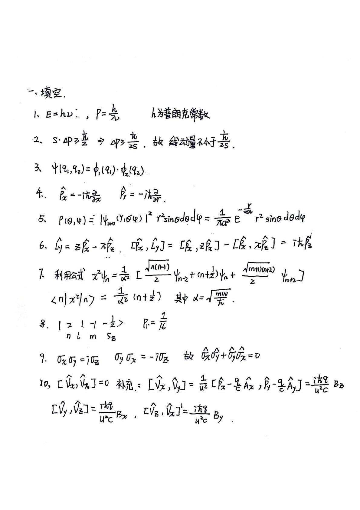 二、简答1、物质波:即函数为概率波,它的模方指空间中某点某时刻可能出现的几率密度,其中概率密度的大小受波动规律的支配。2、简并度:由其能量确定的同一能级状态,可以有多个与之对应的波函数。3、波函数假设:微观物理系统的状态由一个波函数完全描述。量子态演化假设:量子系统的状态随时间的演化满足薛定鄂方程。算符假设:量子力学中的可观测量由厄米算符来表示。测量假设:若算符F为量子力学中的一个力学量,其正交归一化本征函数为,对应的本征值为,则任一量子态可表示为Cnn。粒子全同性假设:在量子系统中,存在内禀属性完全相同的粒子,对任意两个这样的粒子进行交换,不会改变系统的状态。4、测不准原理可能同时知...