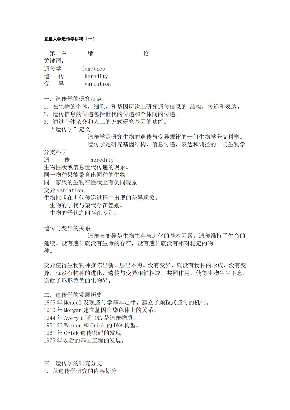 复旦大学遗传学讲稿(一)第一章绪论关键词:遗传学Genetics遗传heredity变异variation一.遗传学的研究特点1.在生物的个体,细胞,和基因层次上研究遗传信息的结构,传递和表达。2.遗传信息的传递包括世代的传递和个体间的传递。3.通过个体杂交和人工的方式研究基因的功能。“遗传学”定义遗传学是研究生物的遗传与变异规律的一门生物学分支科学。遗传学是研究基因结构,信息传递,表达和调控的一门生物学分支科学遗传heredity生物性状或信息世代传递的现象。同一物种只能繁育出同种的生物同一家族的生物在性状上有类同现象变异variation生物性状在世代传递过程中出现的差异现象。生物的子代与...