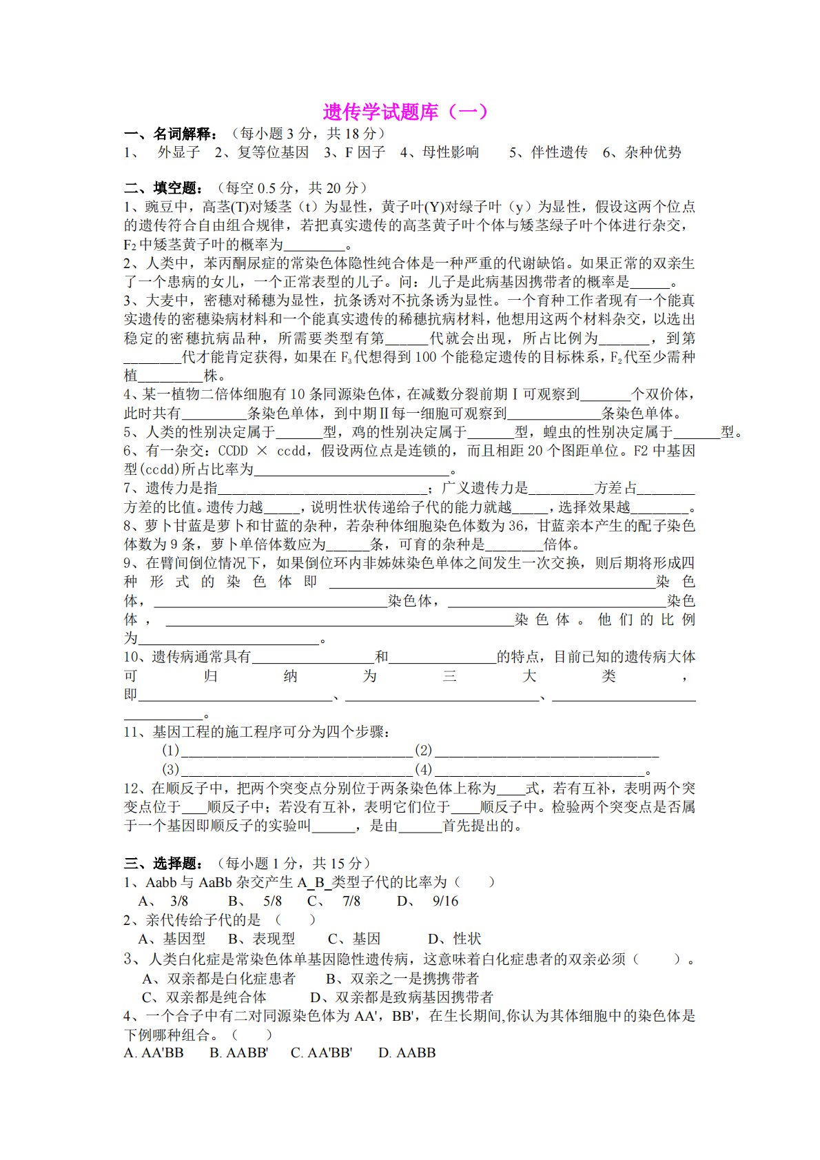 遗传学试题库(一)一、名词解释:(每小题3分,共18分)1、外显子2、复等位基因3、F因子4、母性影响5、伴性遗传6、杂种优势二、填空题:(每空0.5分,共20分)1、豌豆中,高茎(T)对矮茎(t)为显性,黄子叶(Y)对绿子叶(y)为显性,假设这两个位点的遗传符合自由组合规律,若把真实遗传的高茎黄子叶个体与矮茎绿子叶个体进行杂交,F2中矮茎黄子叶的概率为。2、人类中,苯丙酮尿症的常染色体隐性纯合体是一种严重的代谢缺馅。如果正常的双亲生了一个患病的女儿,一个正常表型的儿子。问:儿子是此病基因携带者的概率是。3、大麦中,密穗对稀穗为显性,抗条诱对不抗条诱为显性。一个育种工作者现有一个能真实遗传的密...