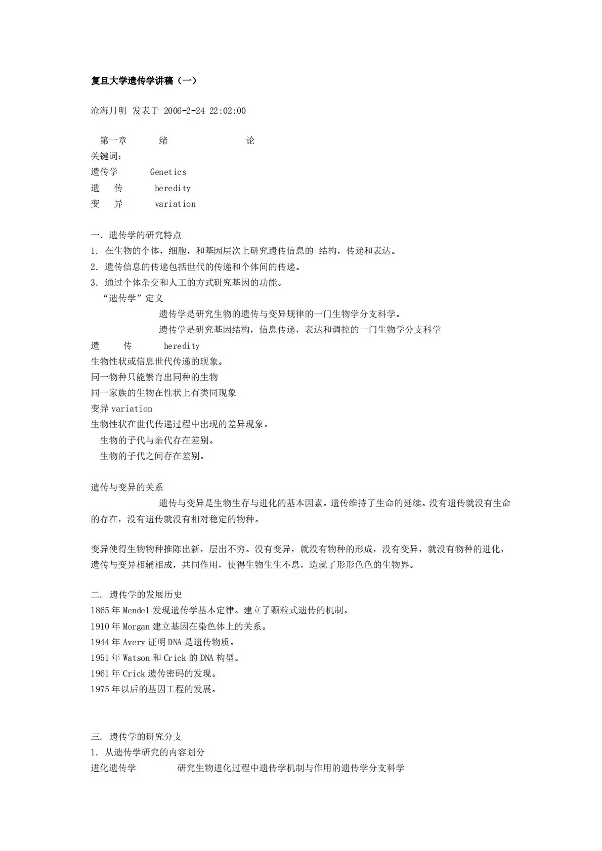 复旦大学遗传学讲稿(一)沧海月明发表于2006-2-2422:02:00第一章绪论关键词:遗传学Genetics遗传heredity变异variation一.遗传学的研究特点1.在生物的个体,细胞,和基因层次上研究遗传信息的结构,传递和表达。2.遗传信息的传递包括世代的传递和个体间的传递。3.通过个体杂交和人工的方式研究基因的功能。“遗传学”定义遗传学是研究生物的遗传与变异规律的一门生物学分支科学。遗传学是研究基因结构,信息传递,表达和调控的一门生物学分支科学遗传heredity生物性状或信息世代传递的现象。同一物种只能繁育出同种的生物同一家族的生物在性状上有类同现象变异variation生物...