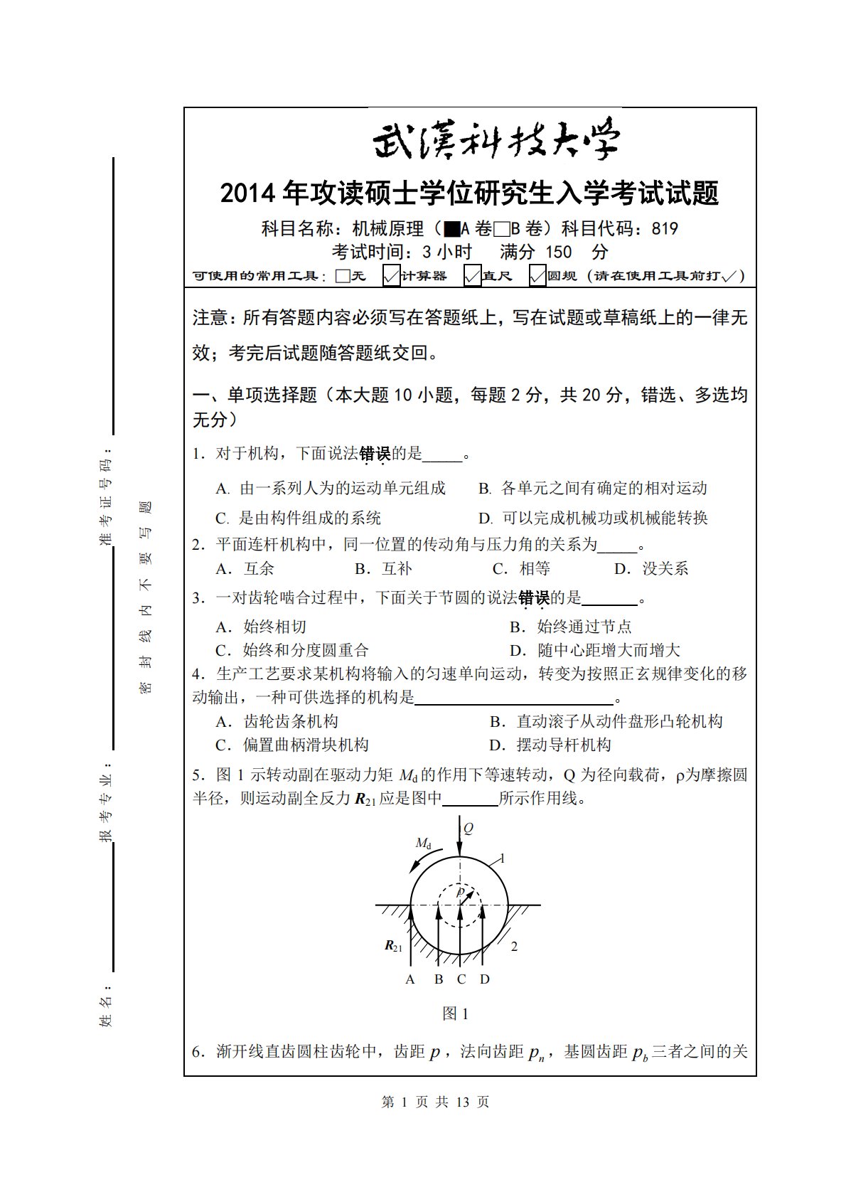 第1页共13页姓名:报考专业:准考证号码:密封线内不要写题2014年攻读硕士学位研究生入学考试试题科目名称:机械原理(■A卷□B卷)科目代码:819考试时间:3小时满分150分可使用的常用工具:□无√计算器√直尺√圆规(请在使用工具前打√)注意:所有答题内容必须写在答题纸上,写在试题或草稿纸上的一律无效;考完后试题随答题纸交回。一、单项选择题(本大题10小题,每题2分,共20分,错选、多选均无分)1.对于机构,下面说法错误..的是_____。A.由一系列人为的运动单元组成B.各单元之间有确定的相对运动C.是由构件组成的系统D.可以完成机械功或机械能转换2.平面连杆机构中,同一位置的传动角与压力...