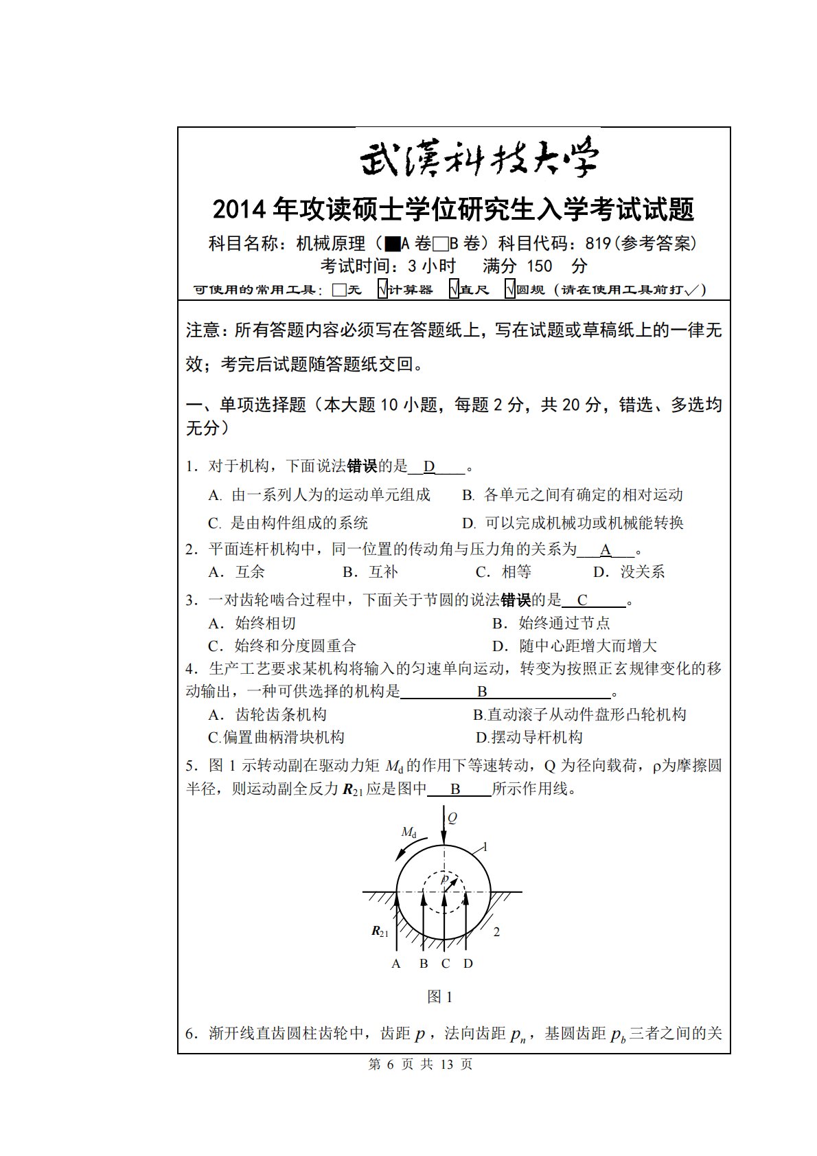 第6页共13页2014年攻读硕士学位研究生入学考试试题科目名称:机械原理(■A卷□B卷)科目代码:819(参考答案)考试时间:3小时满分150分可使用的常用工具:□无计算器直尺圆规(请在使用工具前打√)注意:所有答题内容必须写在答题纸上,写在试题或草稿纸上的一律无效;考完后试题随答题纸交回。一、单项选择题(本大题10小题,每题2分,共20分,错选、多选均无分)1.对于机构,下面说法错误的是__D____。A.由一系列人为的运动单元组成B.各单元之间有确定的相对运动C.是由构件组成的系统D.可以完成机械功或机械能转换2.平面连杆机构中,同一位置的传动角与压力角的关系为___A___。A.互...