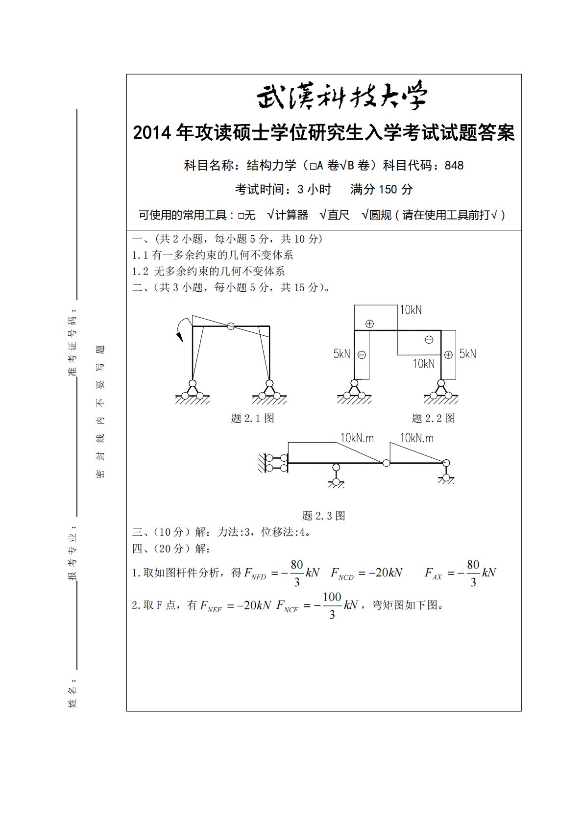 姓名:报考专业:准考证号码:密封线内不要写题2014年攻读硕士学位研究生入学考试试题答案科目名称:结构力学(□A卷√B卷)科目代码:848考试时间:3小时满分150分可使用的常用工具:□无√计算器√直尺√圆规(请在使用工具前打√)一、(共2小题,每小题5分,共10分)1.1有一多余约束的几何不变体系1.2无多余约束的几何不变体系二、(共3小题,每小题5分,共15分)。题2.1图题2.2图题2.3图三、(10分)解:力法:3,位移法:4。四、(20分)解:1.取如图杆件分析,得kNFNFD380kNFNCD20kNFAX3802.取F点,有kNFNEF20kNFNCF3100...