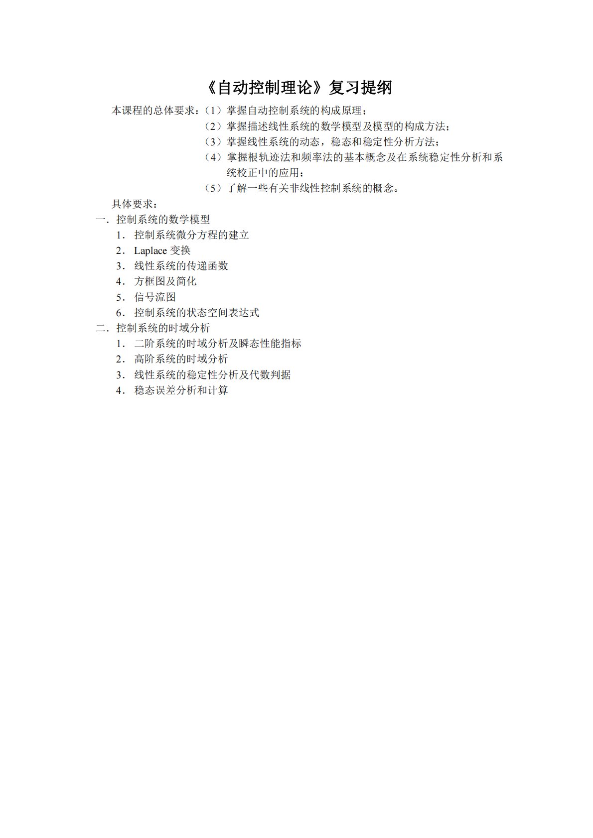 《自动控制理论》复习提纲本课程的总体要求:(1)掌握自动控制系统的构成原理;(2)掌握描述线性系统的数学模型及模型的构成方法;(3)掌握线性系统的动态,稳态和稳定性分析方法;(4)掌握根轨迹法和频率法的基本概念及在系统稳定性分析和系统校正中的应用;(5)了解一些有关非线性控制系统的概念。具体要求:一.控制系统的数学模型1.控制系统微分方程的建立2.Laplace变换3.线性系统的传递函数4.方框图及简化5.信号流图6.控制系统的状态空间表达式二.控制系统的时域分析1.二阶系统的时域分析及瞬态性能指标2.高阶系统的时域分析3.线性系统的稳定性分析及代数判据4.稳态误差分析和计算《自动控制理论》复...