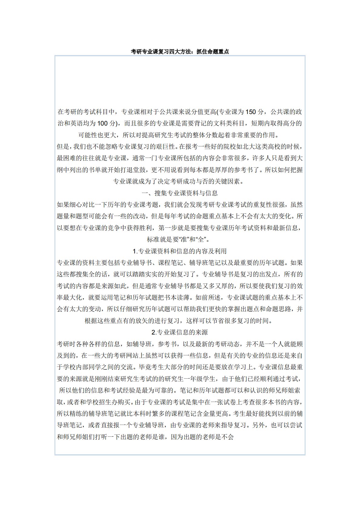 考研专业课复习四大方法:抓住命题重点在考研的考试科目中,专业课相对于公共课来说分值更高(专业课为150分,公共课的政治和英语均为100分),而且很多的专业课是需要背记的文科类科目,短期内取得高分的可能性也更大,所以对提高研究生考试的整体分数起着非常重要的作用。但是,我们也不能忽略专业课复习的艰巨性。在报考一些好的院校如北大这类高校的时候,最困难的往往就是专业课,通常一门专业课所包括的内容会非常很多,许多人只是看到大纲中列出的书单就开始打退堂鼓,更不用说看到每本都是厚厚的参考书了。所以如何把握专业课就成为了决定考研成功与否的关键因素。一、搜集专业课资料与信息如果细心对比一下历年的专业课考题,我们...