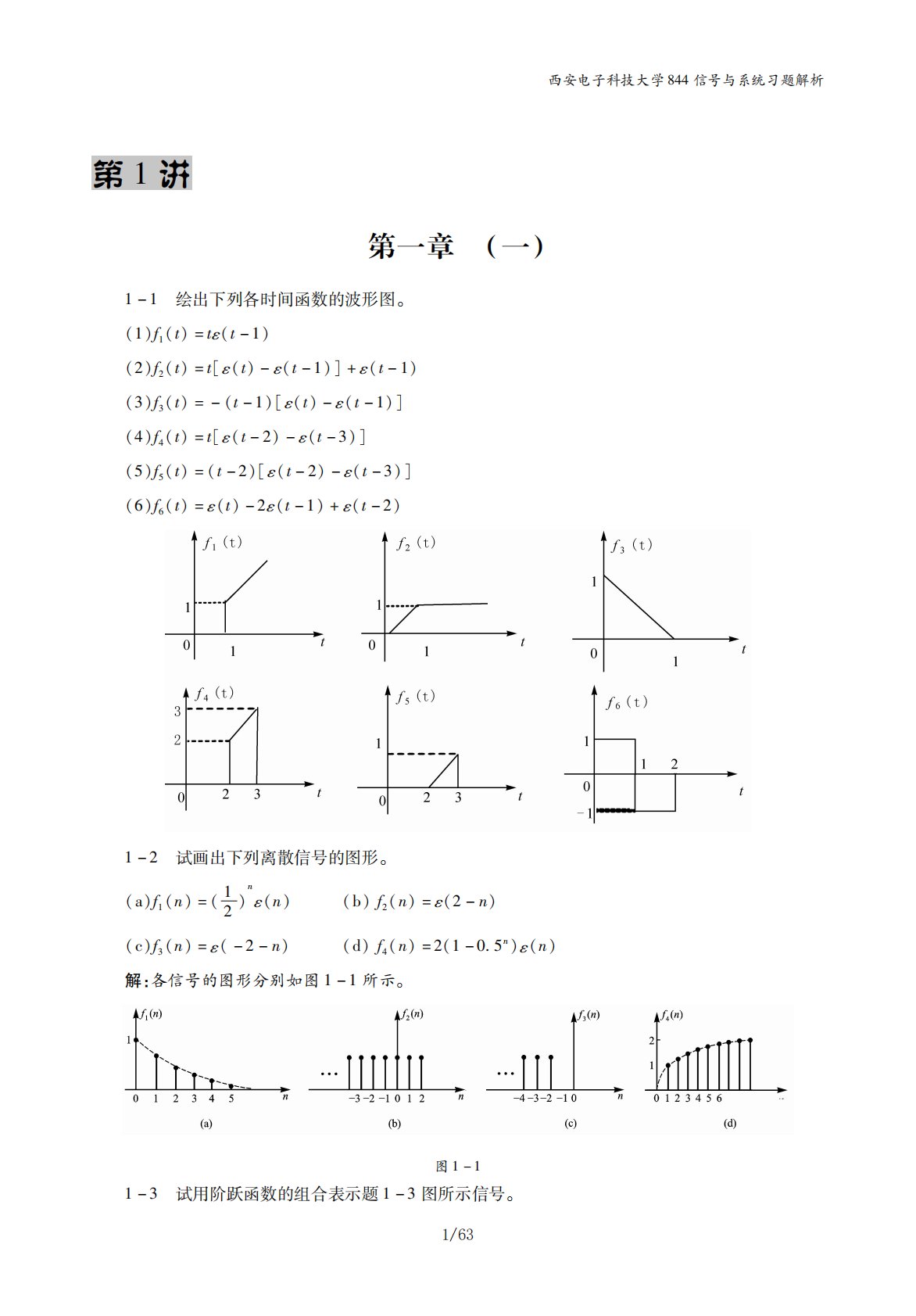 第1讲第一章 (一)1-1 绘出下列各时间函数的波形图。(1)f1(t)=tε(t-1)(2)f2(t)=t[ε(t)-ε(t-1)]+ε(t-1)(3)f3(t)=-(t-1)[ε(t)-ε(t-1)](4)f4(t)=t[ε(t-2)-ε(t-3)](5)f5(t)=(t-2)[ε(t-2)-ε(t-3)](6)f6(t)=ε(t)-2ε(t-1)+ε(t-2)1-2 试画出下列离散信号的图形。(a)f1(n)=(12)nε(n) (b)f2(n)=ε(2-n)(c)f3(n)=ε(-2-n)(d)f4(n)=2(1-0.5n)ε(n)解:各信号的图形分别如图1-1所示。图1-11-3...
