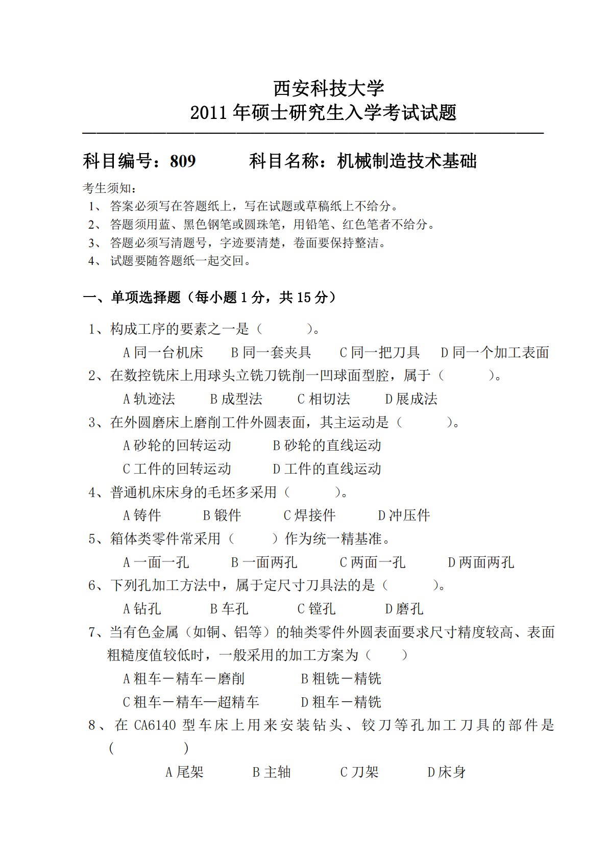 西安科技大学2011年硕士研究生入学考试试题─────────────────────────────────科目编号:809科目名称:机械制造技术基础考生须知:1、答案必须写在答题纸上,写在试题或草稿纸上不给分。2、答题须用蓝、黑色钢笔或圆珠笔,用铅笔、红色笔者不给分。3、答题必须写清题号,字迹要清楚,卷面要保持整洁。4、试题要随答题纸一起交回。一、单项选择题(每小题1分,共15分)1、构成工序的要素之一是()。A同一台机床B同一套夹具C同一把刀具D同一个加工表面2、在数控铣床上用球头立铣刀铣削一凹球面型腔,属于()。A轨迹法B成型法C相切法D展成法3、在外圆磨床上磨削工件外圆表面,其主运动...