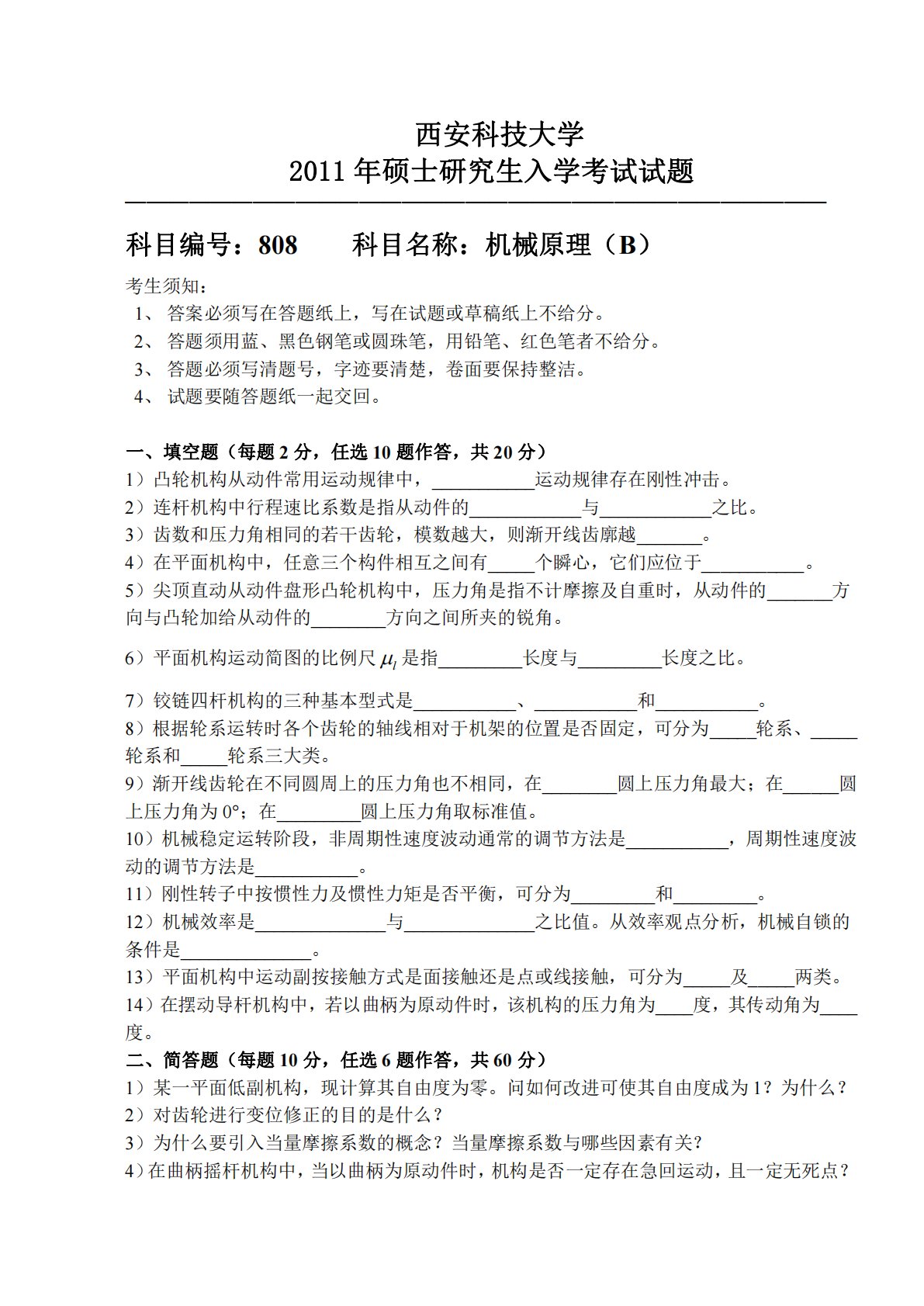 西安科技大学2011年硕士研究生入学考试试题─────────────────────────────────科目编号:808科目名称:机械原理(B)考生须知:1、答案必须写在答题纸上,写在试题或草稿纸上不给分。2、答题须用蓝、黑色钢笔或圆珠笔,用铅笔、红色笔者不给分。3、答题必须写清题号,字迹要清楚,卷面要保持整洁。4、试题要随答题纸一起交回。一、填空题(每题2分,任选10题作答,共20分)1)凸轮机构从动件常用运动规律中,___________运动规律存在刚性冲击。2)连杆机构中行程速比系数是指从动件的____________与____________之比。3)齿数和压力角相同的若干齿轮,...