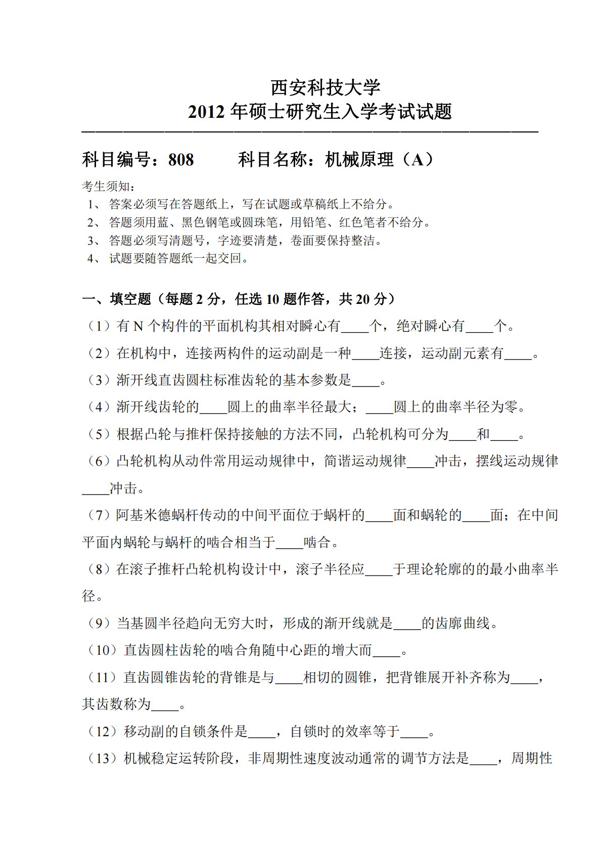 西安科技大学2012年硕士研究生入学考试试题─────────────────────────────────科目编号:808科目名称:机械原理(A)考生须知:1、答案必须写在答题纸上,写在试题或草稿纸上不给分。2、答题须用蓝、黑色钢笔或圆珠笔,用铅笔、红色笔者不给分。3、答题必须写清题号,字迹要清楚,卷面要保持整洁。4、试题要随答题纸一起交回。一、填空题(每题2分,任选10题作答,共20分)(1)有N个构件的平面机构其相对瞬心有个,绝对瞬心有个。(2)在机构中,连接两构件的运动副是一种连接,运动副元素有。(3)渐开线直齿圆柱标准齿轮的基本参数是。(4)渐开线齿轮的圆上的曲率半径最大;圆上的曲...