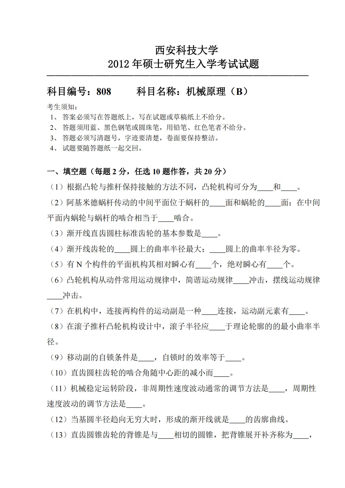 西安科技大学2012年硕士研究生入学考试试题─────────────────────────────────科目编号:808科目名称:机械原理(B)考生须知:1、答案必须写在答题纸上,写在试题或草稿纸上不给分。2、答题须用蓝、黑色钢笔或圆珠笔,用铅笔、红色笔者不给分。3、答题必须写清题号,字迹要清楚,卷面要保持整洁。4、试题要随答题纸一起交回。一、填空题(每题2分,任选10题作答,共20分)(1)根据凸轮与推杆保持接触的方法不同,凸轮机构可分为和。(2)阿基米德蜗杆传动的中间平面位于蜗杆的面和蜗轮的面;在中间平面内蜗轮与蜗杆的啮合相当于啮合。(3)渐开线直齿圆柱标准齿轮的基本参数是。(4)渐...