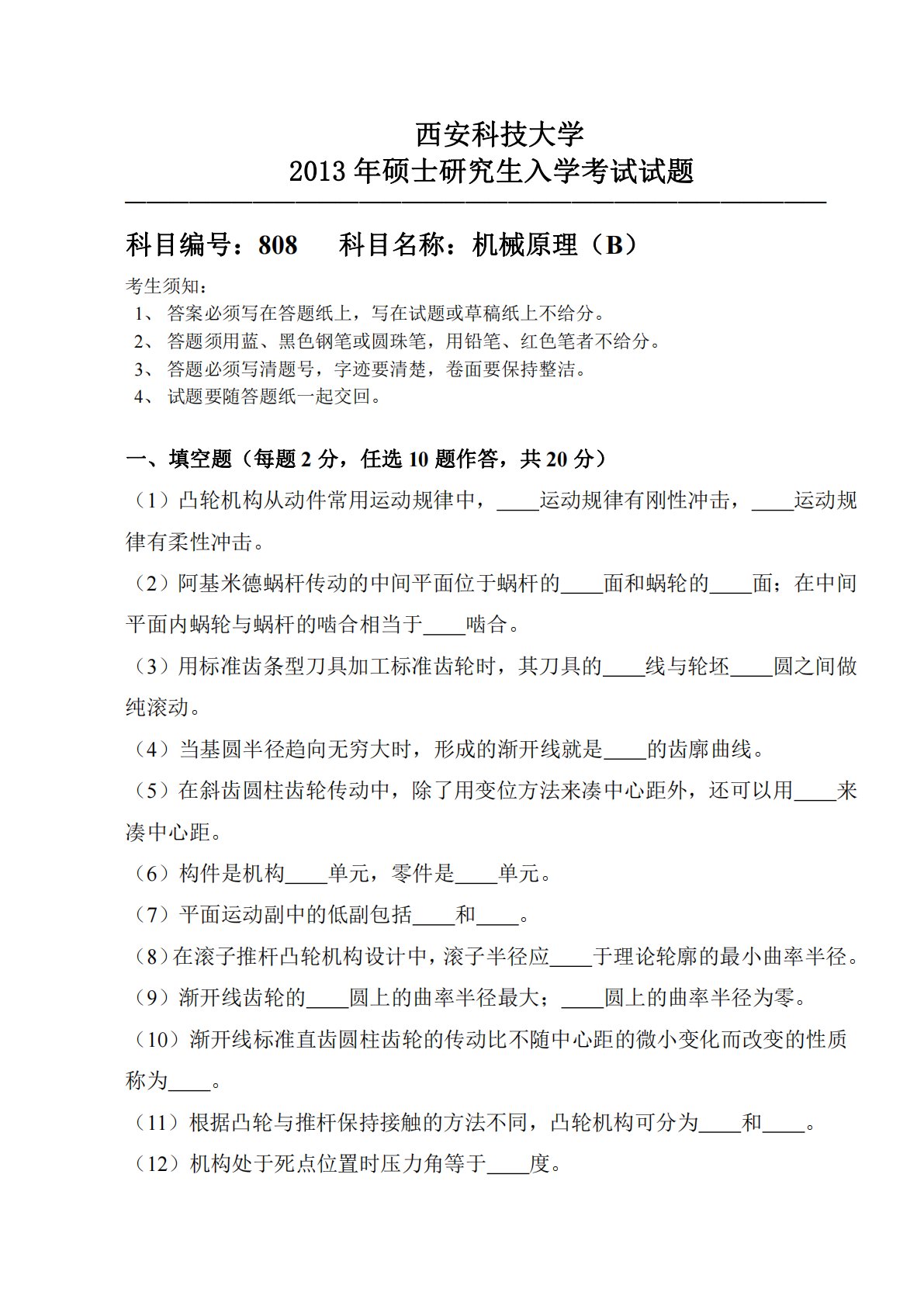 西安科技大学2013年硕士研究生入学考试试题─────────────────────────────────科目编号:808科目名称:机械原理(B)考生须知:1、答案必须写在答题纸上,写在试题或草稿纸上不给分。2、答题须用蓝、黑色钢笔或圆珠笔,用铅笔、红色笔者不给分。3、答题必须写清题号,字迹要清楚,卷面要保持整洁。4、试题要随答题纸一起交回。一、填空题(每题2分,任选10题作答,共20分)(1)凸轮机构从动件常用运动规律中,运动规律有刚性冲击,运动规律有柔性冲击。(2)阿基米德蜗杆传动的中间平面位于蜗杆的面和蜗轮的面;在中间平面内蜗轮与蜗杆的啮合相当于啮合。(3)用标准齿条型刀具加工标准齿...