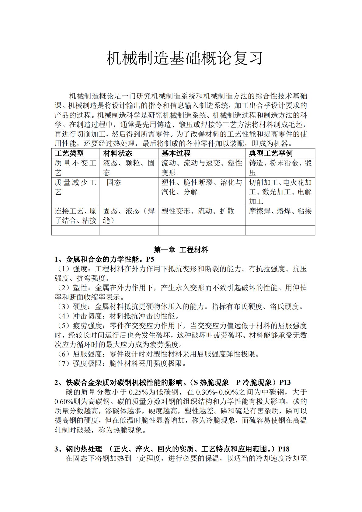 机械制造基础概论复习机械制造概论是一门研究机械制造系统和机械制造方法的综合性技术基础课。机械制造是将设计输出的指令和信息输入制造系统,加工出合乎设计要求的产品的过程。机械制造科学是研究机械制造系统、机械制造过程和制造方法的科学。在制造过程中,通常是先用铸造、锻压或焊接等工艺方法将材料制成毛坯,再进行切削加工,然后得到所需零件。为了改善材料的工艺性能和提高零件的使用性能,还要经过热处理,最后将制成的各种零件加以装配,即成为机器。工艺类型材料状态基本过程典型工艺举例质量不变工艺液态、颗粒、固态流动、流动与速变、塑性变形铸造、粉末冶金、锻压质量减少工艺固态塑性、脆性断裂、溶化与汽化、分解切削加工、电...