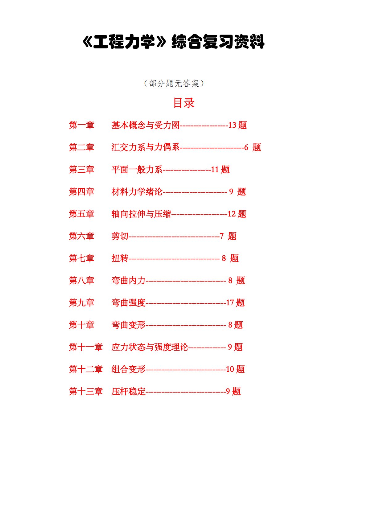 《工程力学》综合复习资料(部分题无答案)目录第一章基本概念与受力图------------------13题第二章汇交力系与力偶系------------------------6题第三章平面一般力系------------------11题第四章材料力学绪论------------------------9题第五章轴向拉伸与压缩---------------------12题第六章剪切----------------------------------7题第七章扭转----------------------------------8题第八章弯曲内力---------------------...