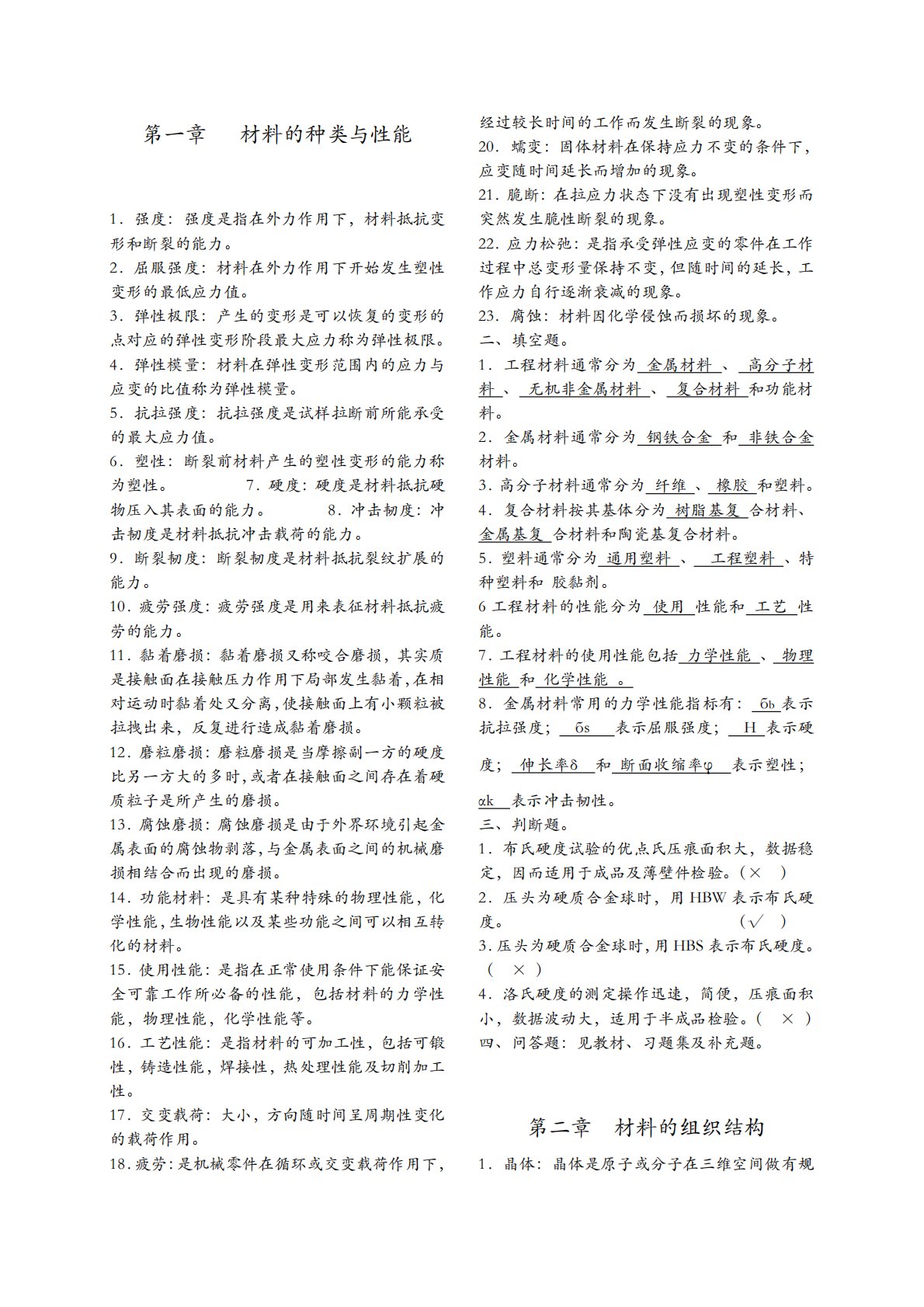 第一章材料的种类与性能1.强度:强度是指在外力作用下,材料抵抗变形和断裂的能力。2.屈服强度:材料在外力作用下开始发生塑性变形的最低应力值。3.弹性极限:产生的变形是可以恢复的变形的点对应的弹性变形阶段最大应力称为弹性极限。4.弹性模量:材料在弹性变形范围内的应力与应变的比值称为弹性模量。5.抗拉强度:抗拉强度是试样拉断前所能承受的最大应力值。6.塑性:断裂前材料产生的塑性变形的能力称为塑性。7.硬度:硬度是材料抵抗硬物压入其表面的能力。8.冲击韧度:冲击韧度是材料抵抗冲击载荷的能力。9.断裂韧度:断裂韧度是材料抵抗裂纹扩展的能力。10.疲劳强度:疲劳强度是用来表征材料抵抗疲劳的能力。11.黏...