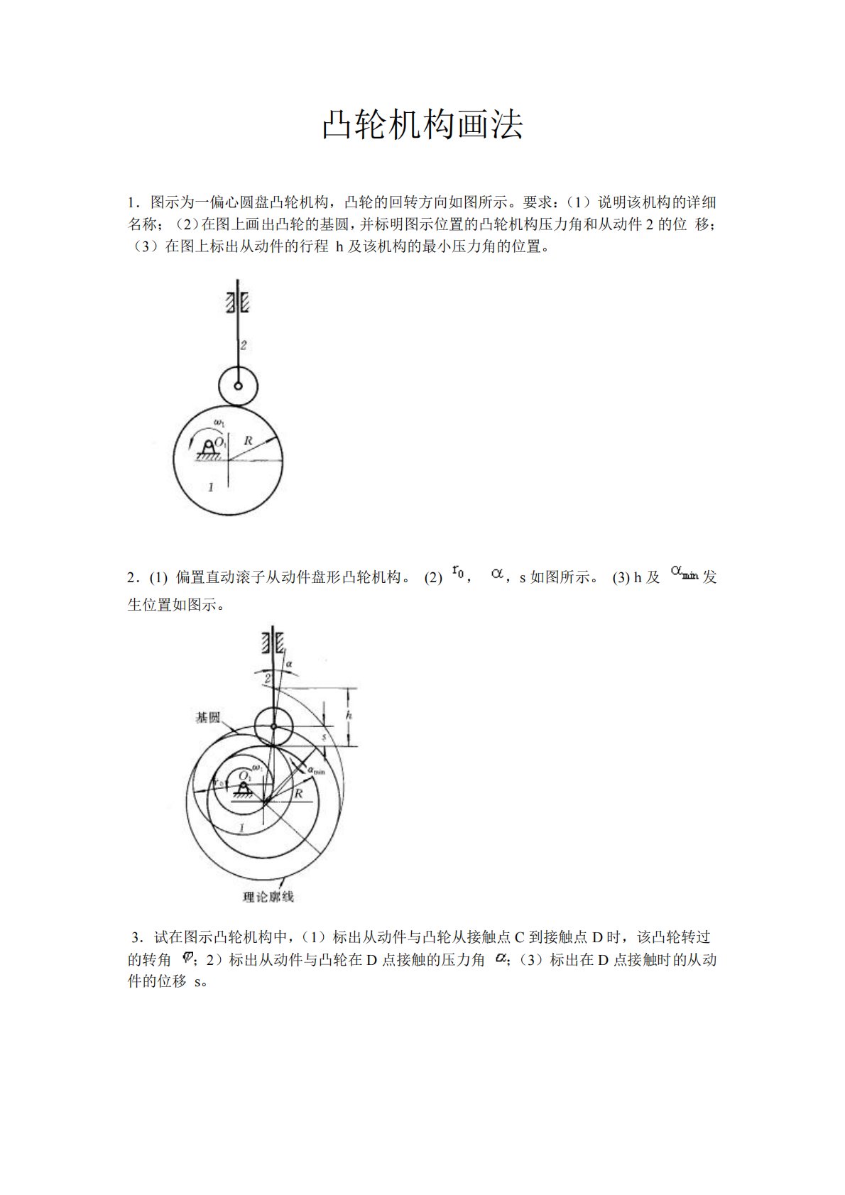 凸轮机构画法1.图示为一偏心圆盘凸轮机构,凸轮的回转方向如图所示。要求:(1)说明该机构的详细名称;(2)在图上画出凸轮的基圆,并标明图示位置的凸轮机构压力角和从动件2的位移;(3)在图上标出从动件的行程h及该机构的最小压力角的位置。2.(1)偏置直动滚子从动件盘形凸轮机构。(2),,s如图所示。(3)h及发生位置如图示。3.试在图示凸轮机构中,(1)标出从动件与凸轮从接触点C到接触点D时,该凸轮转过的转角;2)标出从动件与凸轮在D点接触的压力角;(3)标出在D点接触时的从动件的位移s。4.(1)如图示。(2)如图示。(3)s如图示。5.图示偏置直动滚子从动件盘形凸轮机构中,凸轮以角速度逆时针...