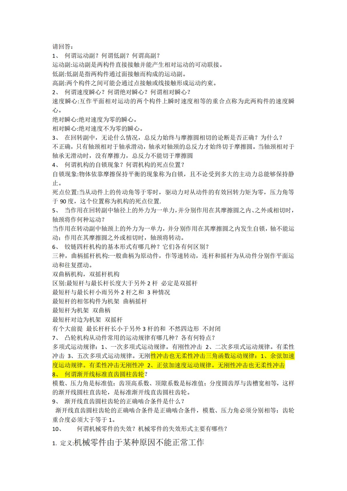 请回答:1、何谓运动副?何谓低副?何谓高副?运动副:运动副是两构件直接接触并能产生相对运动的可动联接。低副:低副是指两构件通过面接触而构成的运动副。高副:两个构件之间可能会通过点接触或线接触形成运动约束。2、何谓速度瞬心?何谓绝对瞬心?何谓相对瞬心?速度瞬心:互作平面相对运动的两个构件上瞬时速度相等的重合点称为此两构件的速度瞬心。绝对瞬心:绝对速度为零的瞬心。相对瞬心:绝对速度不为零的瞬心。3、在回转副中,无论什么情况,总反力始终与摩擦圆相切的论断是否正确?为什么?不正确,只有轴颈相对于轴承滑动,轴承对轴颈的总反力才始终切于摩擦圆。当轴颈相对于轴承无滑动时,没有摩擦力,总反力不能切于摩擦圆4、...