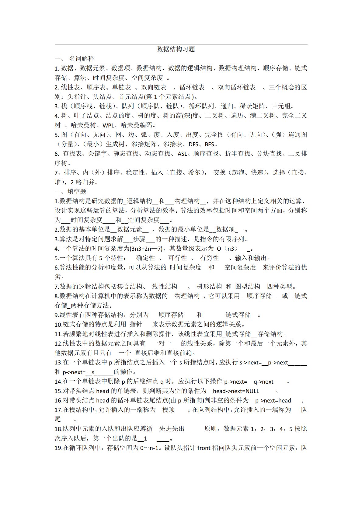 数据结构习题一、名词解释1.数据、数据元素、数据项、数据结构、数据的逻辑结构、数据物理结构、顺序存储、链式存储、算法、时间复杂度、空间复杂度。2.线性表、顺序表、单链表、双向链表、循环链表、双向循环链表、三个概念的区别:头指针、头结点、首元结点(第1个元素结点)。3.栈(顺序栈、链栈)、队列(顺序队、链队)、循环队列、递归、稀疏矩阵、三元组。4.树、叶子结点、结点的度、树的度、树的高(深)度、二叉树、遍历、满二叉树、完全二叉树、哈夫曼树、WPL、哈夫曼编码。5.图(有向、无向)、网、边、弧、度、入度、出度、完全图(有向、无向)、(强)连通图(分量)、(最小)生成树、邻接矩阵、邻接表、DFS、B...