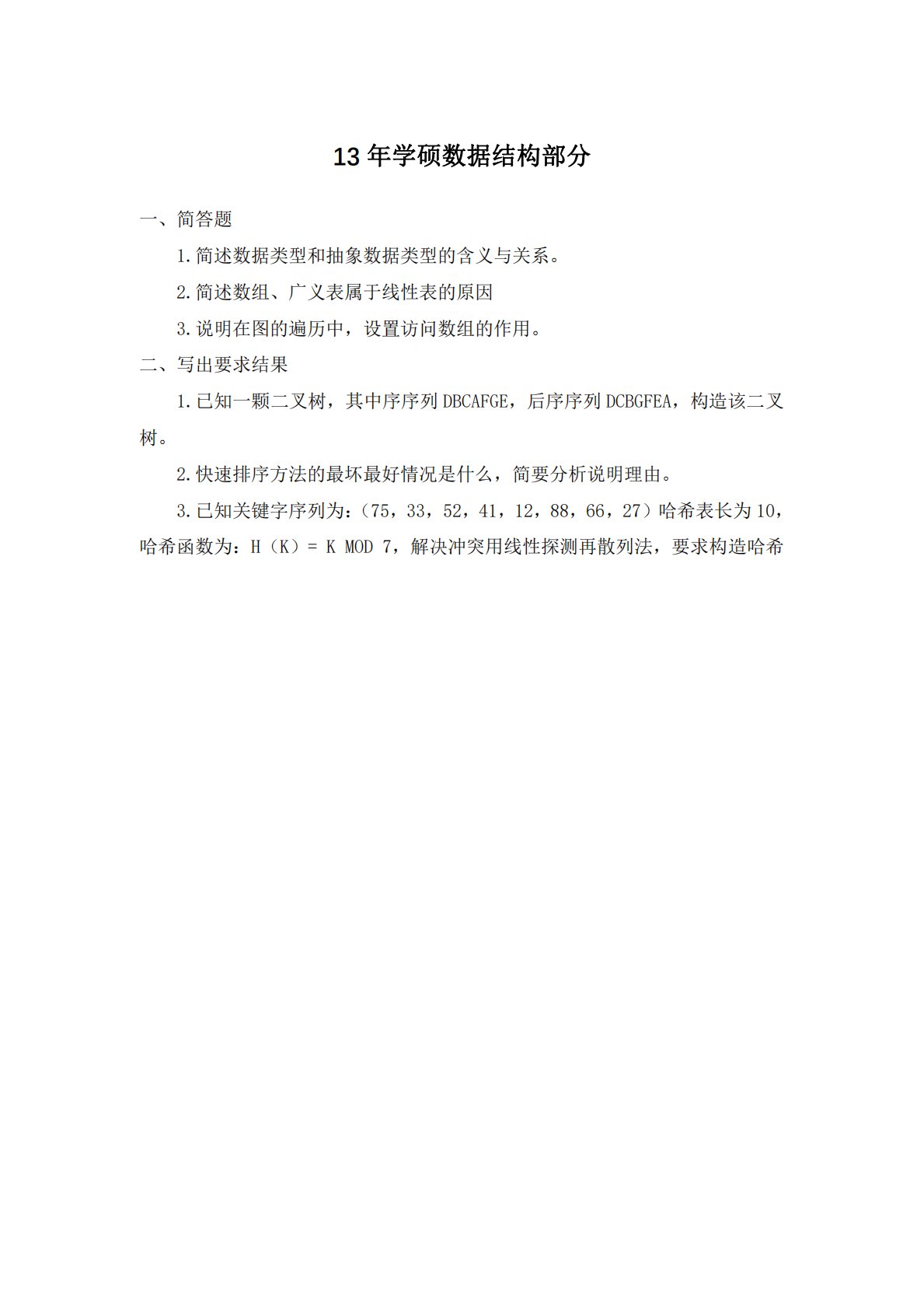 13年学硕数据结构部分一、简答题1.简述数据类型和抽象数据类型的含义与关系。2.简述数组、广义表属于线性表的原因3.说明在图的遍历中,设置访问数组的作用。二、写出要求结果1.已知一颗二叉树,其中序序列DBCAFGE,后序序列DCBGFEA,构造该二叉树。2.快速排序方法的最坏最好情况是什么,简要分析说明理由。3.已知关键字序列为:(75,33,52,41,12,88,66,27)哈希表长为10,哈希函数为:H(K)=KMOD7,解决冲突用线性探测再散列法,要求构造哈希13年学硕数据结构部分一、简答题1.简述数据类型和抽象数据类型的含义与关系。2.简述数组、广义表属于线性表的原因3.说明在图的遍...