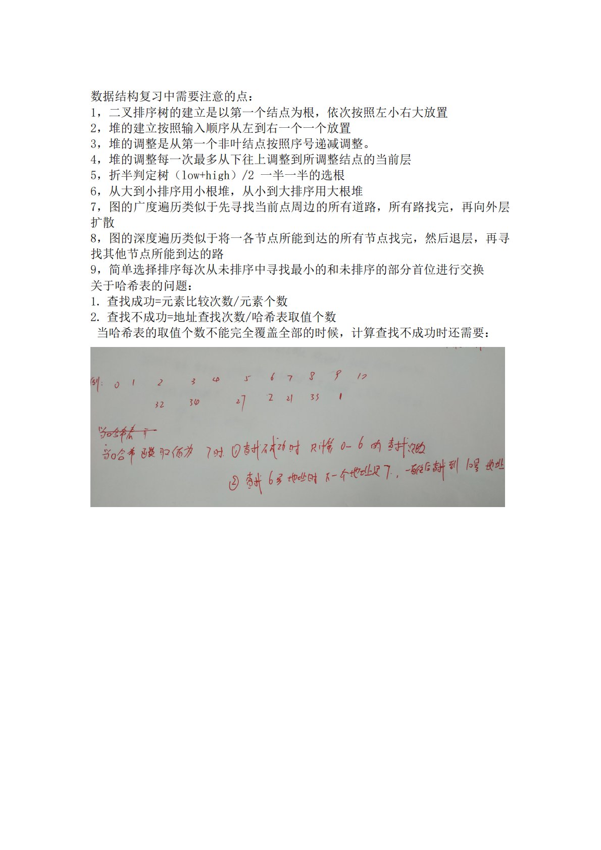 数据结构复习中需要注意的点:1,二叉排序树的建立是以第一个结点为根,依次按照左小右大放置2,堆的建立按照输入顺序从左到右一个一个放置3,堆的调整是从第一个非叶结点按照序号递减调整。4,堆的调整每一次最多从下往上调整到所调整结点的当前层5,折半判定树(low+high)/2一半一半的选根6,从大到小排序用小根堆,从小到大排序用大根堆7,图的广度遍历类似于先寻找当前点周边的所有道路,所有路找完,再向外层扩散8,图的深度遍历类似于将一各节点所能到达的所有节点找完,然后退层,再寻找其他节点所能到达的路9,简单选择排序每次从未排序中寻找最小的和未排序的部分首位进行交换关于哈希表的问题:1.查找成功=元素...