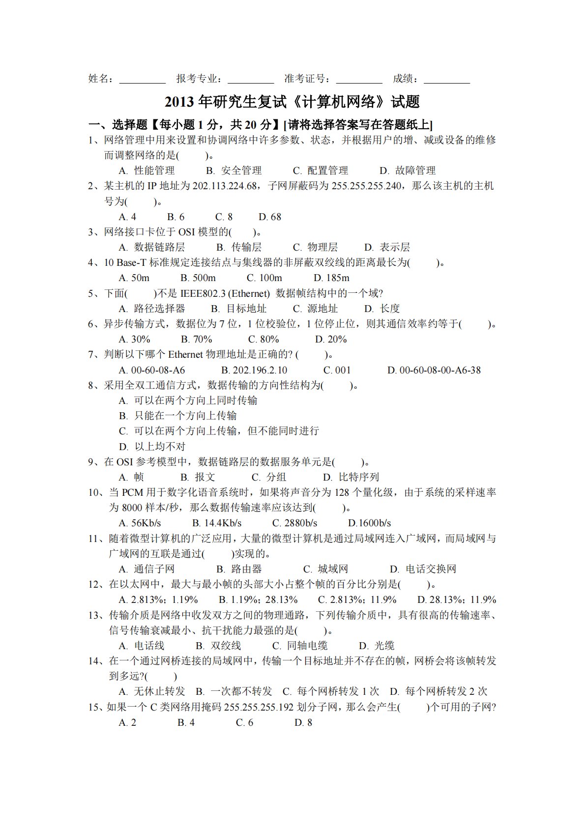 姓名:报考专业:准考证号:成绩:2013年研究生复试《计算机网络》试题一、选择题【每小题1分,共20分】[请将选择答案写在答题纸上]1、网络管理中用来设置和协调网络中许多参数、状态,并根据用户的增、减或设备的维修而调整网络的是()。A.性能管理B.安全管理C.配置管理D.故障管理2、某主机的IP地址为202.113.224.68,子网屏蔽码为255.255.255.240,那么该主机的主机号为()。A.4B.6C.8D.683、网络接口卡位于OSI模型的()。A.数据链路层B.传输层C.物理层D.表示层4、10Base-T标准规定连接结点与集线器的非屏蔽双绞线的距离最长为()。A.50mB.5...