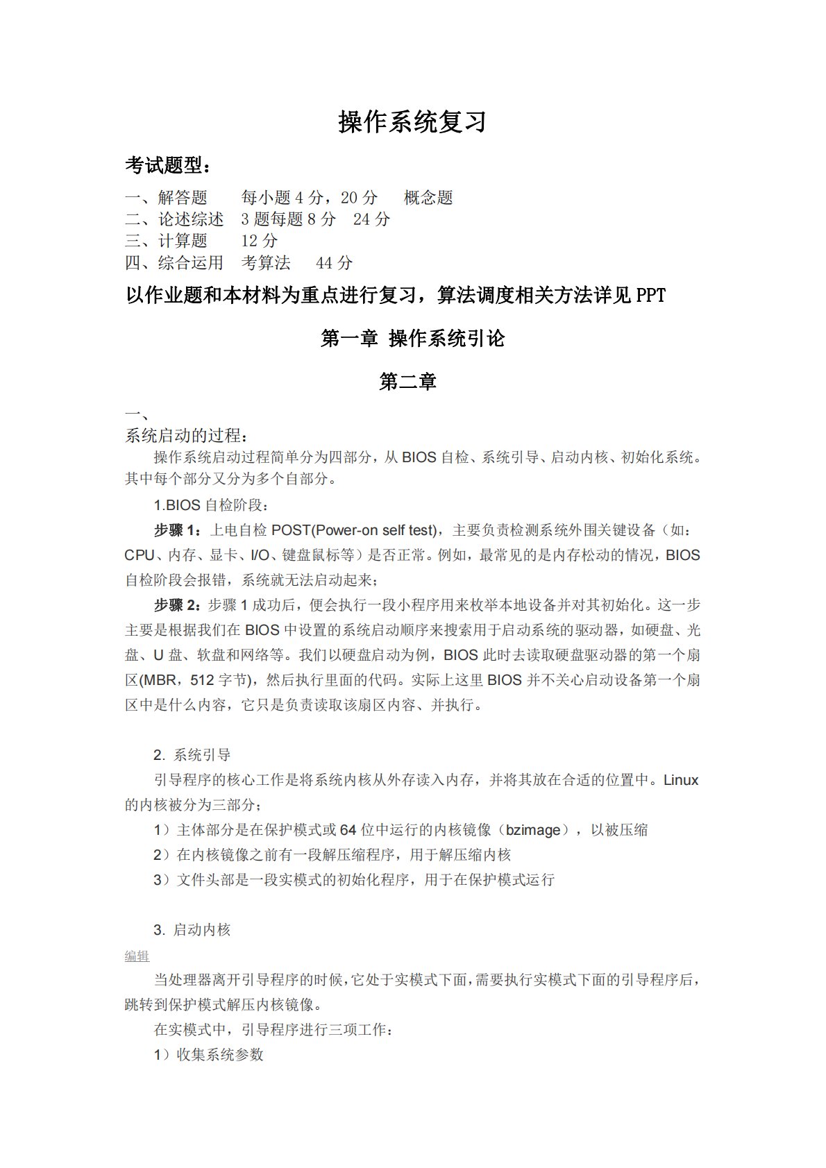 操作系统复习考试题型:一、解答题每小题4分,20分概念题二、论述综述3题每题8分24分三、计算题12分四、综合运用考算法44分以作业题和本材料为重点进行复习,算法调度相关方法详见PPT第一章操作系统引论第二章一、系统启动的过程:操作系统启动过程简单分为四部分,从BIOS自检、系统引导、启动内核、初始化系统。其中每个部分又分为多个自部分。1.BIOS自检阶段:步骤1:上电自检POST(Power-onselftest),主要负责检测系统外围关键设备(如:CPU、内存、显卡、I/O、键盘鼠标等)是否正常。例如,最常见的是内存松动的情况,BIOS自检阶段会报错,系统就无法启动起来;步骤2:步骤1成功...