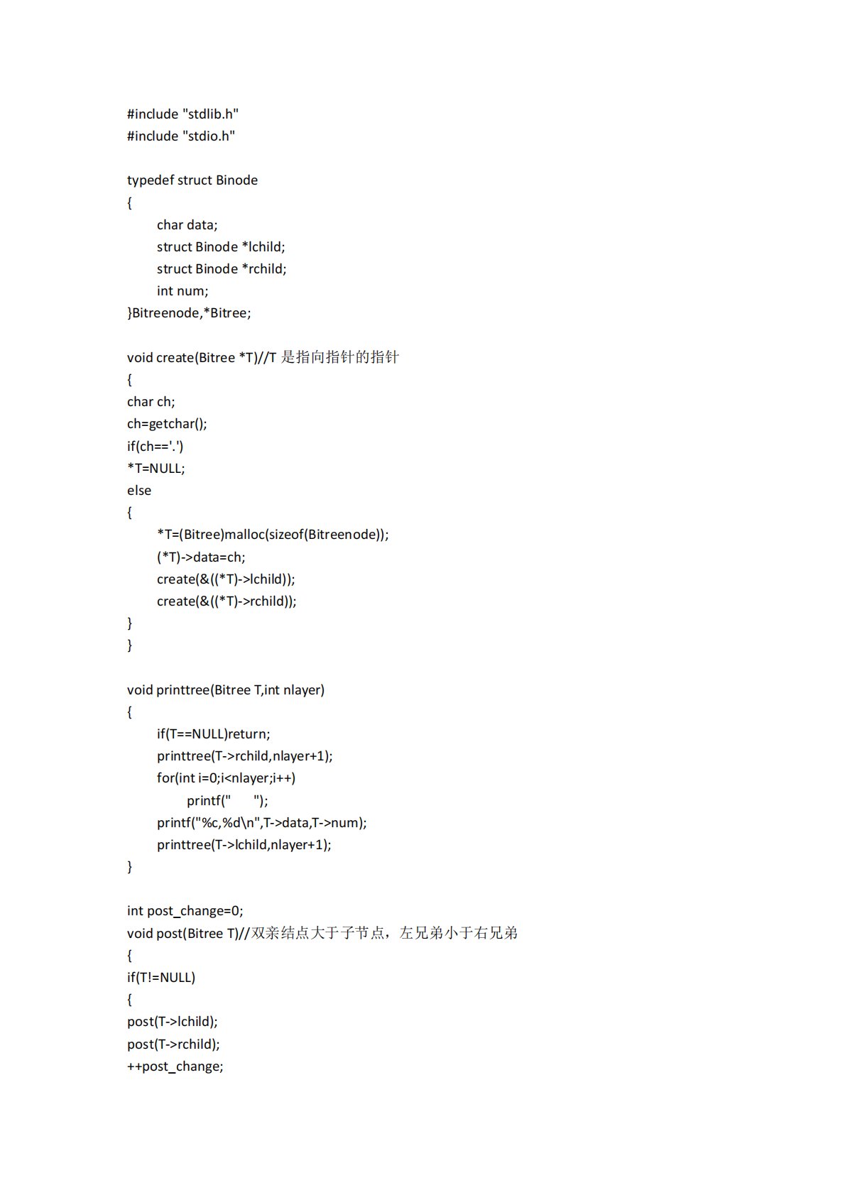 #include"stdlib.h"#include"stdio.h"typedefstructBinode{chardata;structBinode*lchild;structBinode*rchild;intnum;}Bitreenode,*Bitree;voidcreate(Bitree*T)//T是指向指针的指针{charch;ch=getchar();if(ch=='.')*T=NULL;else{*T=(Bitree)malloc(sizeof(Bitreenode));(*T)->data=ch;create(&((*T)->lchild));create(&((*T)->rc...