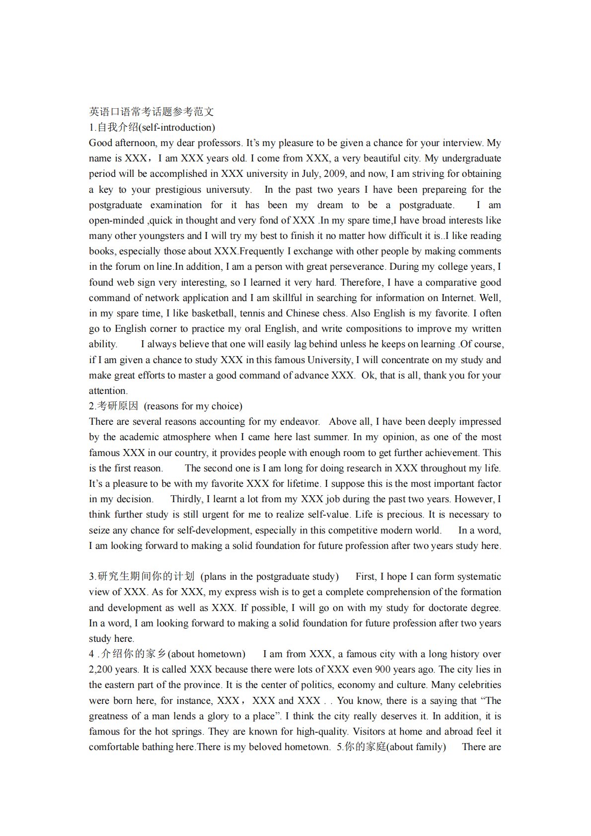 英语口语常考话题参考范文1.自我介绍(self-introduction)Goodafternoon,mydearprofessors.It’smypleasuretobegivenachanceforyourinterview.MynameisXXX,IamXXXyearsold.IcomefromXXX,averybeautifulcity.MyundergraduateperiodwillbeaccomplishedinXXXuniversityinJuly,2009,andnow,Iamstrivingforobtainingakeytoyourprestigiousuniversut...