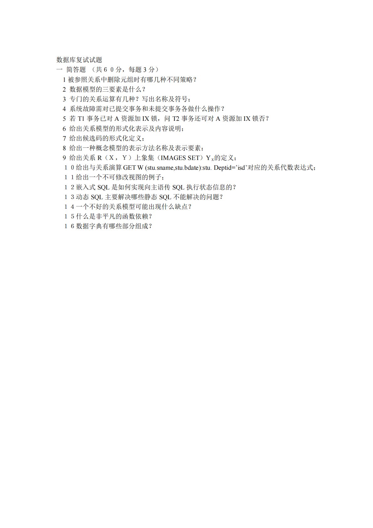 数据库复试试题一简答题(共60分,每题3分)1被参照关系中删除元组时有哪几种不同策略?2数据模型的三要素是什么?3专门的关系运算有几种?写出名称及符号;4系统故障需对已提交事务和未提交事务各做什么操作?5若T1事务已对A资源加IX锁,问T2事务还可对A资源加IX锁否?6给出关系模型的形式化表示及内容说明;7给出候选码的形式化定义;8给出一种概念模型的表示方法名称及表示要素;9给出关系R(X,Y)上象集(IMAGESSET)YX的定义;10给出与关系演算GETW(stu.sname,stu.bdate):stu.Deptid=’isd’对应的关系代数表达式;11给出一个不可修改视图的例子;12嵌...